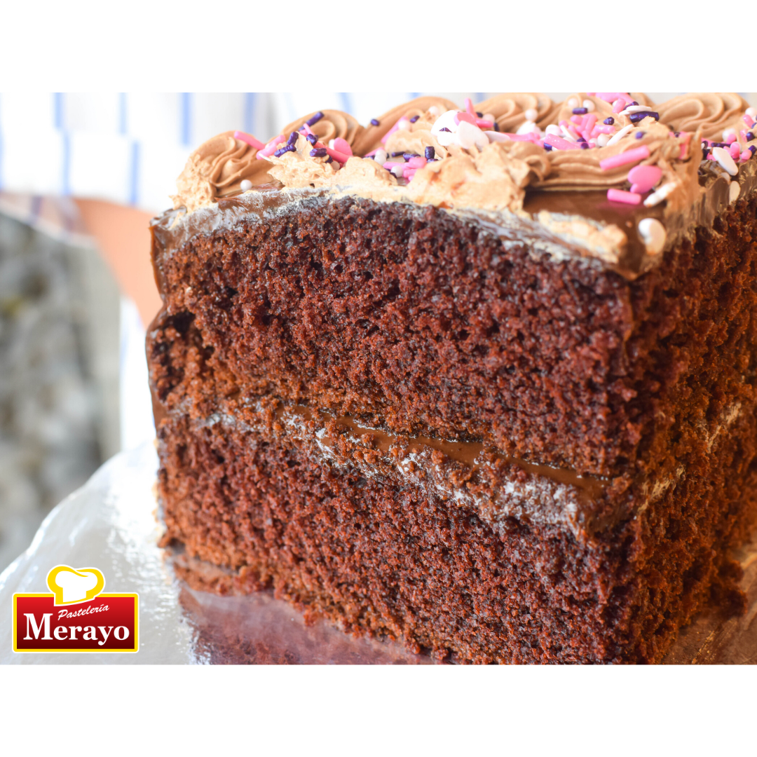 Queque de vainilla bañado de leche de tres leches con relleno de chantilly y chocolate .