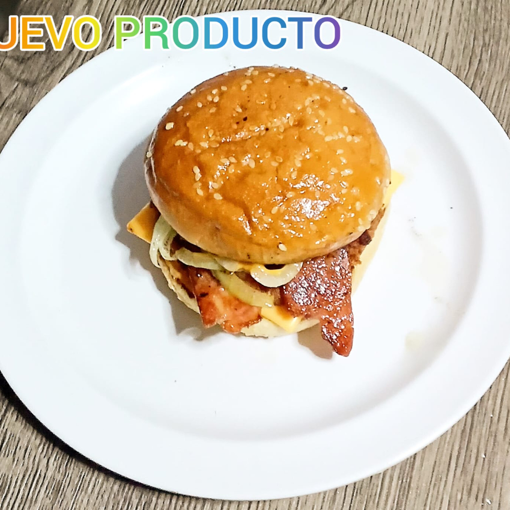 Deliciosa Hamburguesa Doble Queso Cheddar Derretido, Cebolla caramelizada y tocino