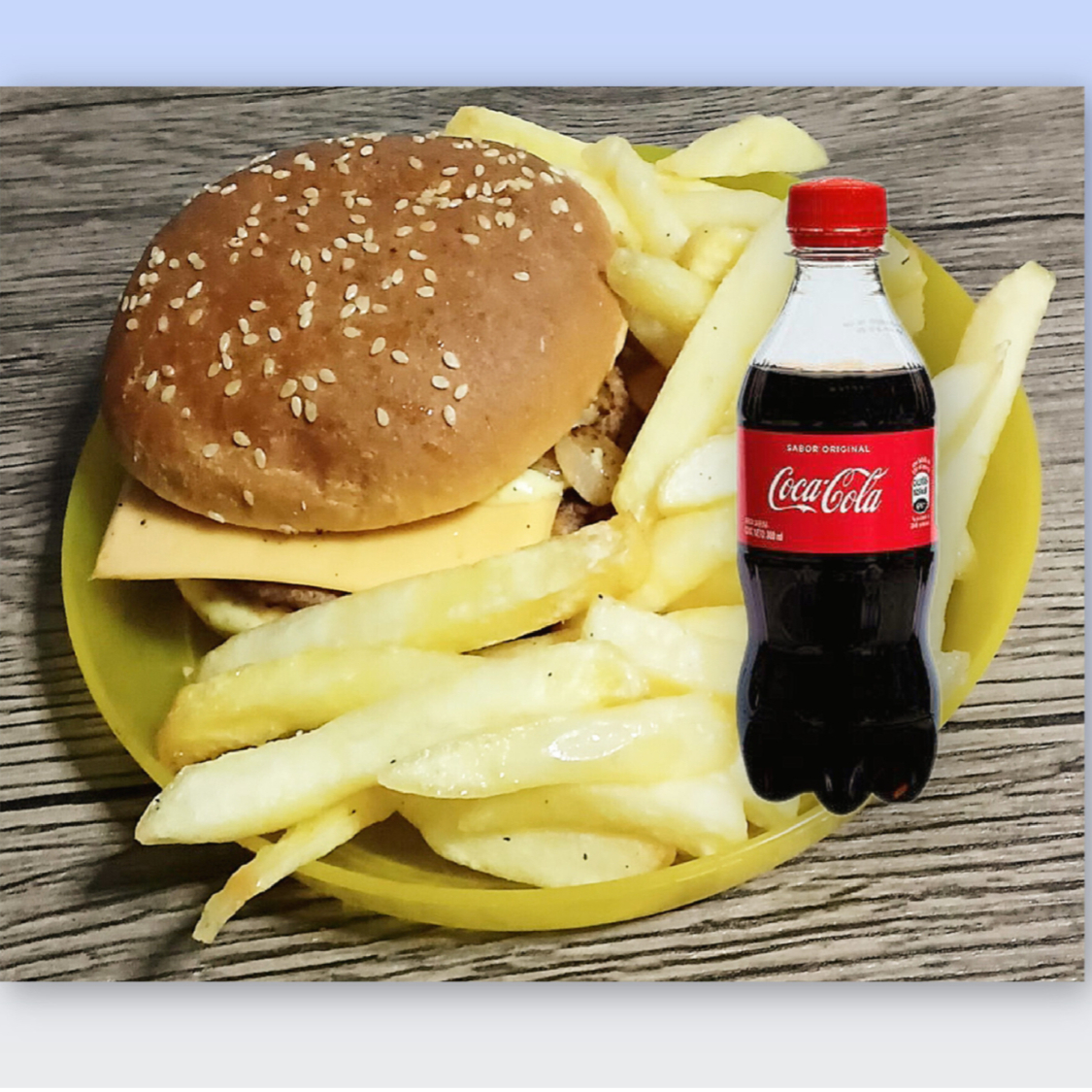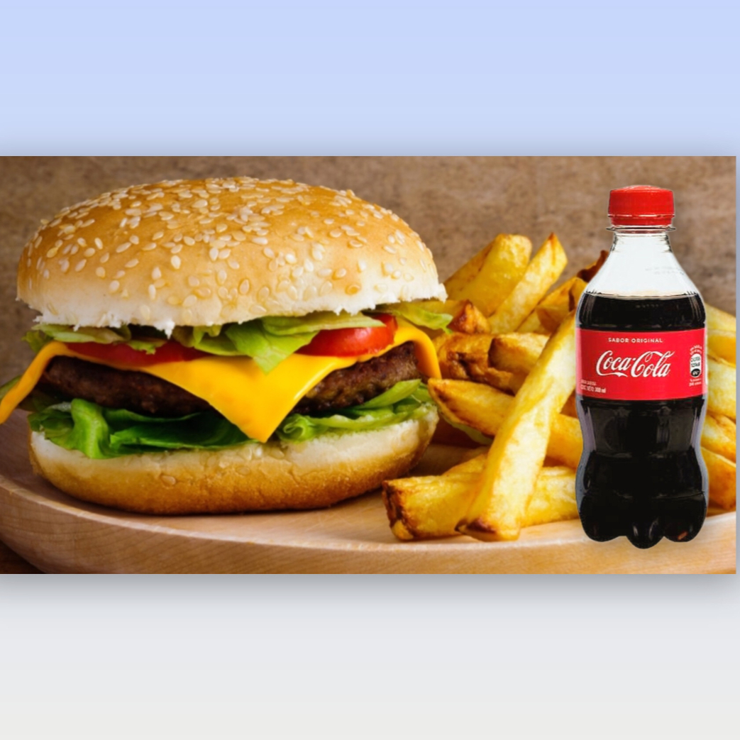 Deliciosa hamburguesa con queso americano, salsa especial, cebolla caramelizada, acompañada de papas.