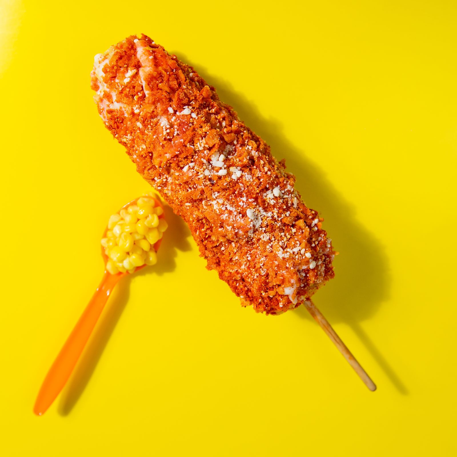 Elote granizado con mayonesa, queso parmesano, Takis, chile y cheddar.