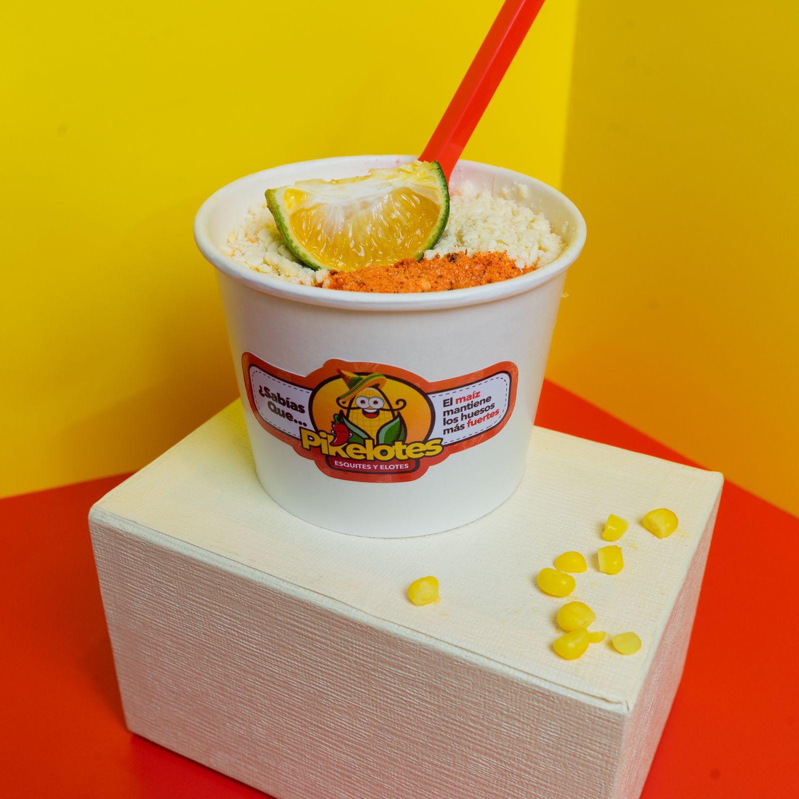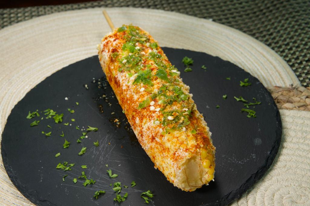 Elote granizado con mayonesa, queso parmesano, paprika y queso cheddar.