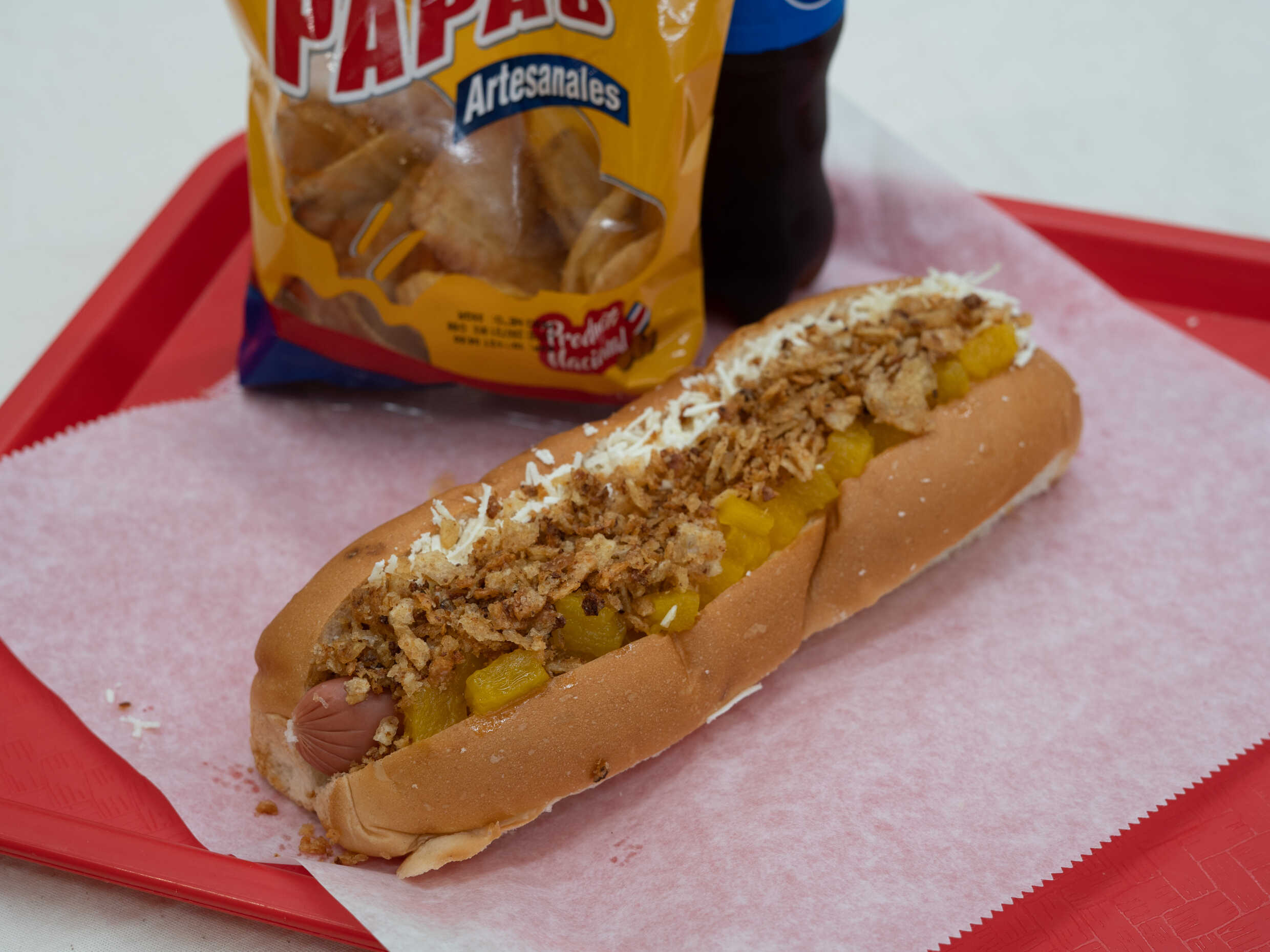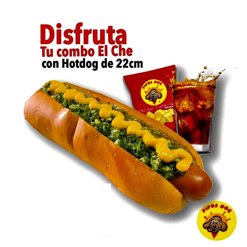 Incluye, repollo, cebolla, chile jalapeño, queso rayado, pepinillo, chimichurri argentino, piña, papita crunch, tocineta, salsa tomate, mayonesa y mostaza. Acompañados de un refresco y papas.