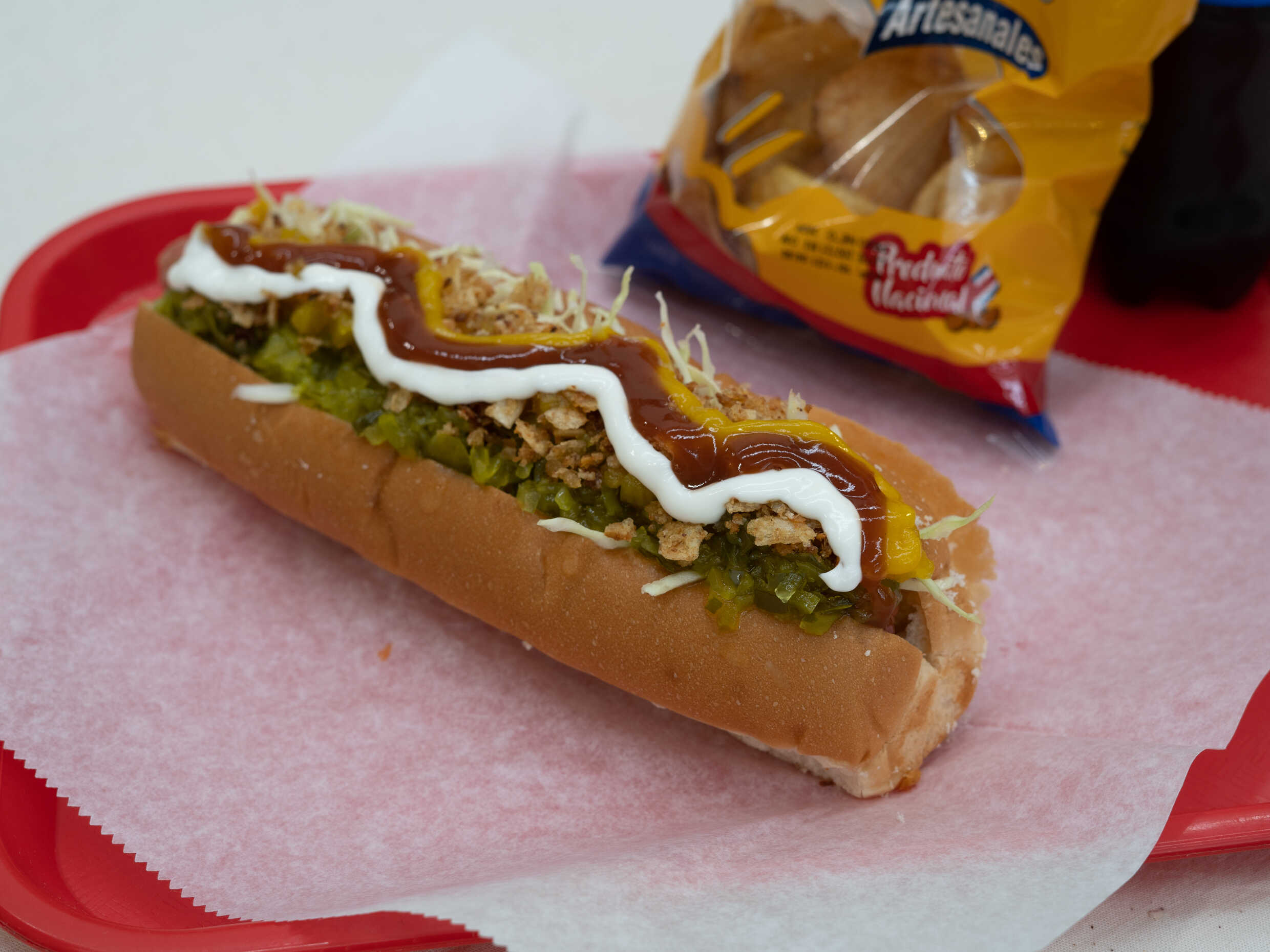 Repollo, cebolla, chile jalapeño, queso rallado, pepinillo, chimichurri argentino, piña, papita crunch, tocineta, tomate mayonesa, mostaza y salsas.