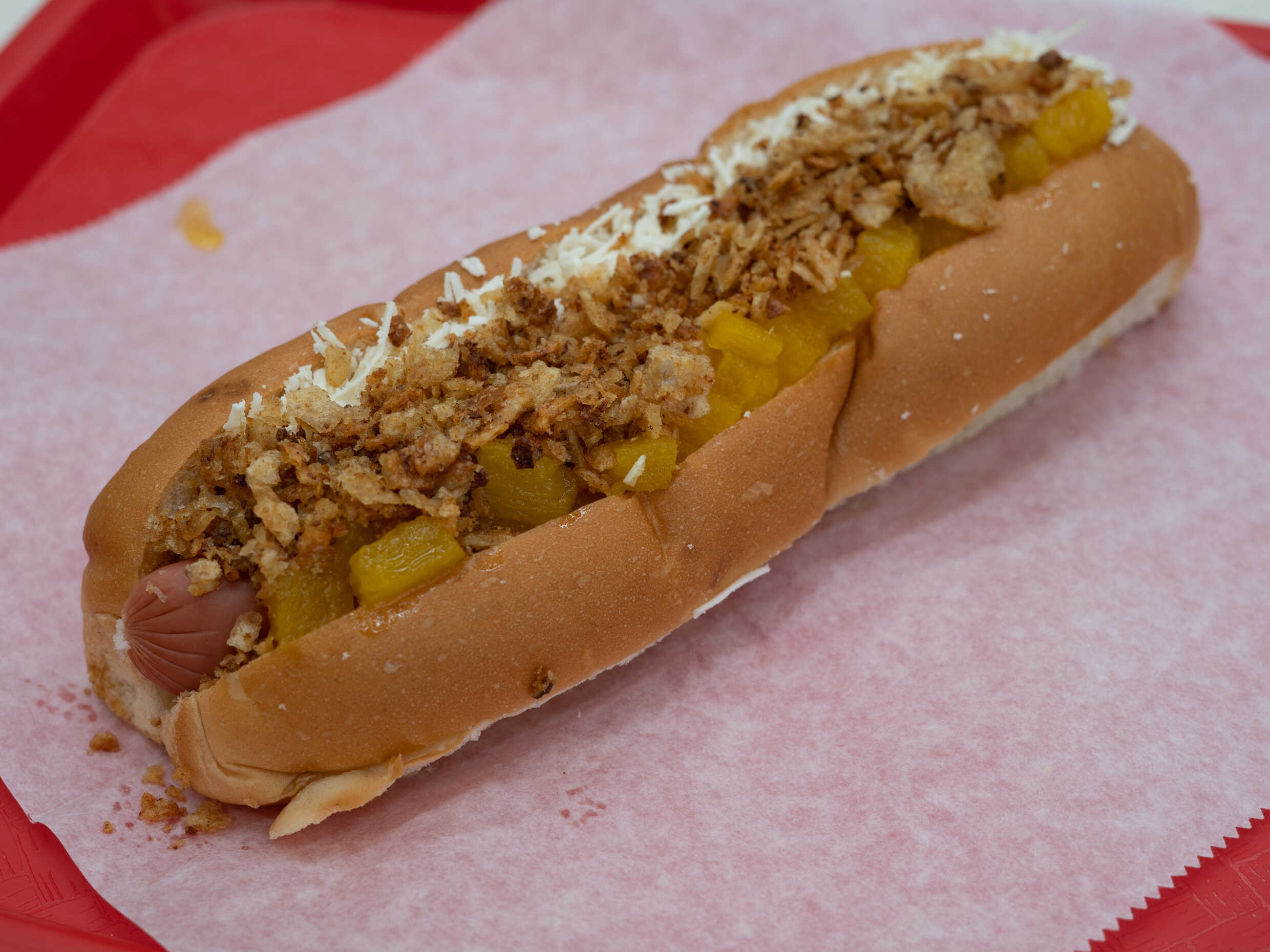 Salchicha ahumada y pan artesanal, con trocitos de piña, queso rallado y tocineta granulada.