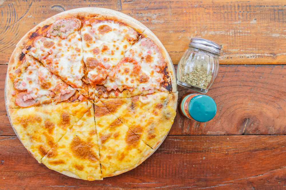 Queso, jamón, cebolla, chile dulce y salsa de pizza.