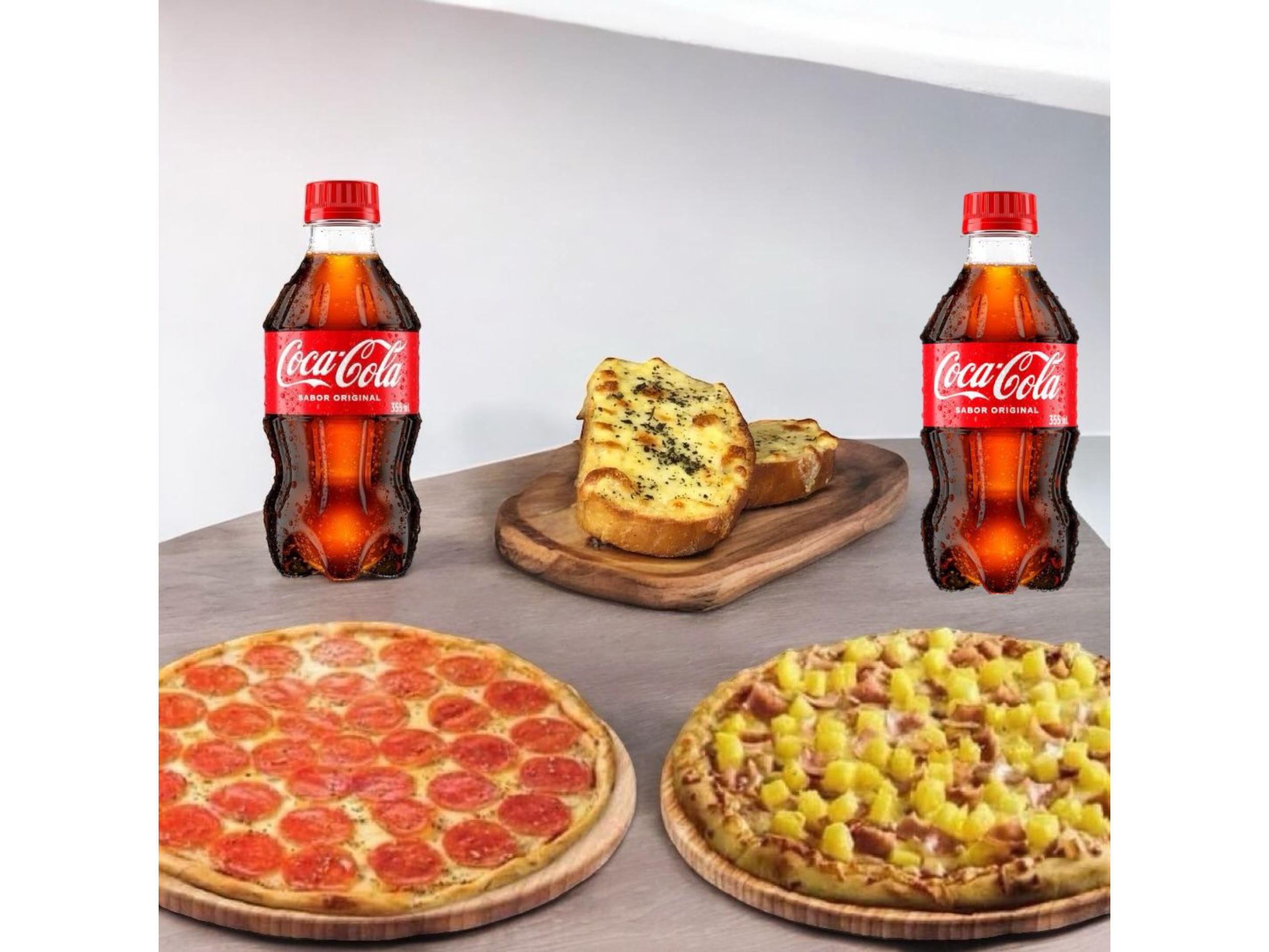 Dos pizzas de 10 pulgadas, 6 porciones, más pan de ajo y 2 refrescos de 355 ml.