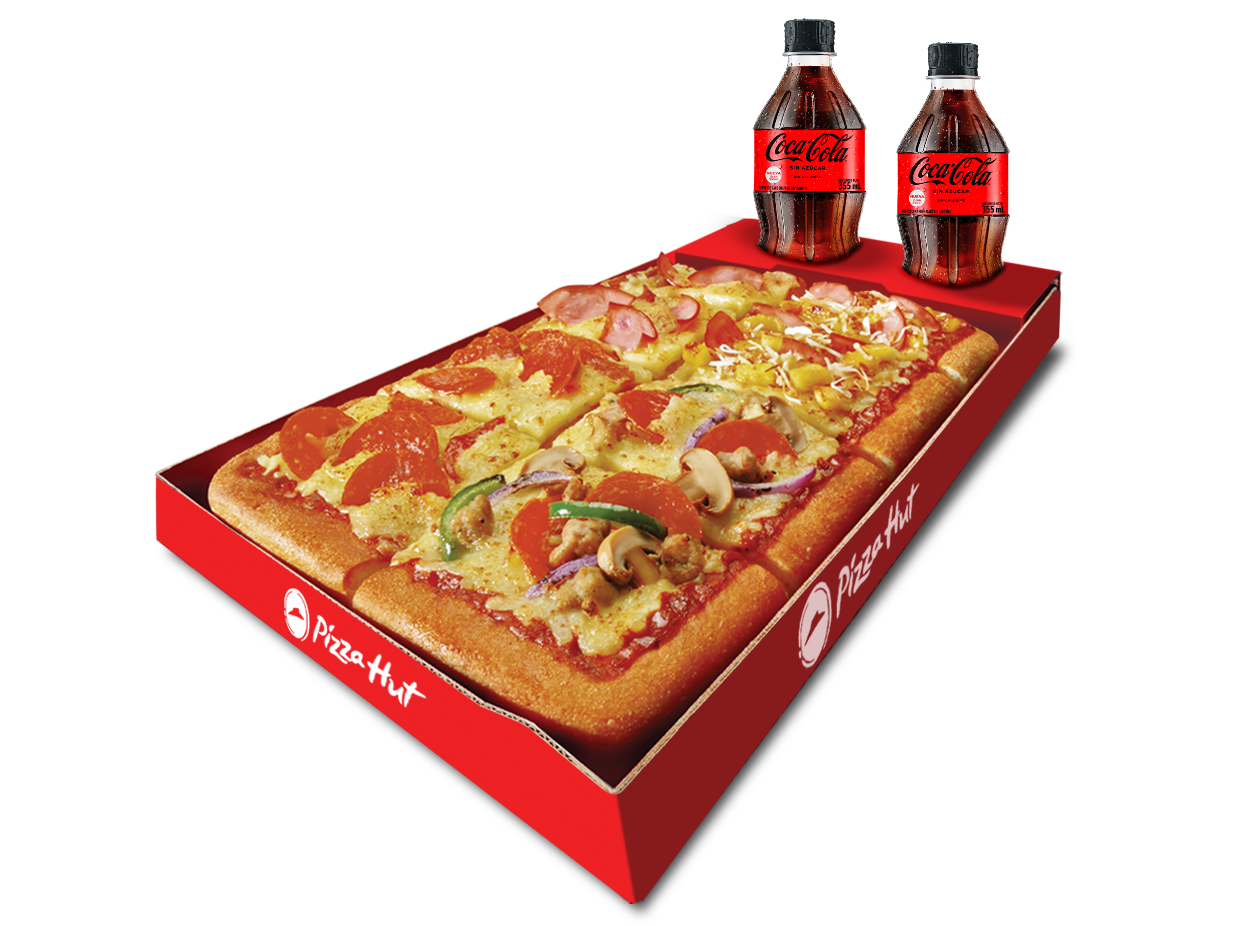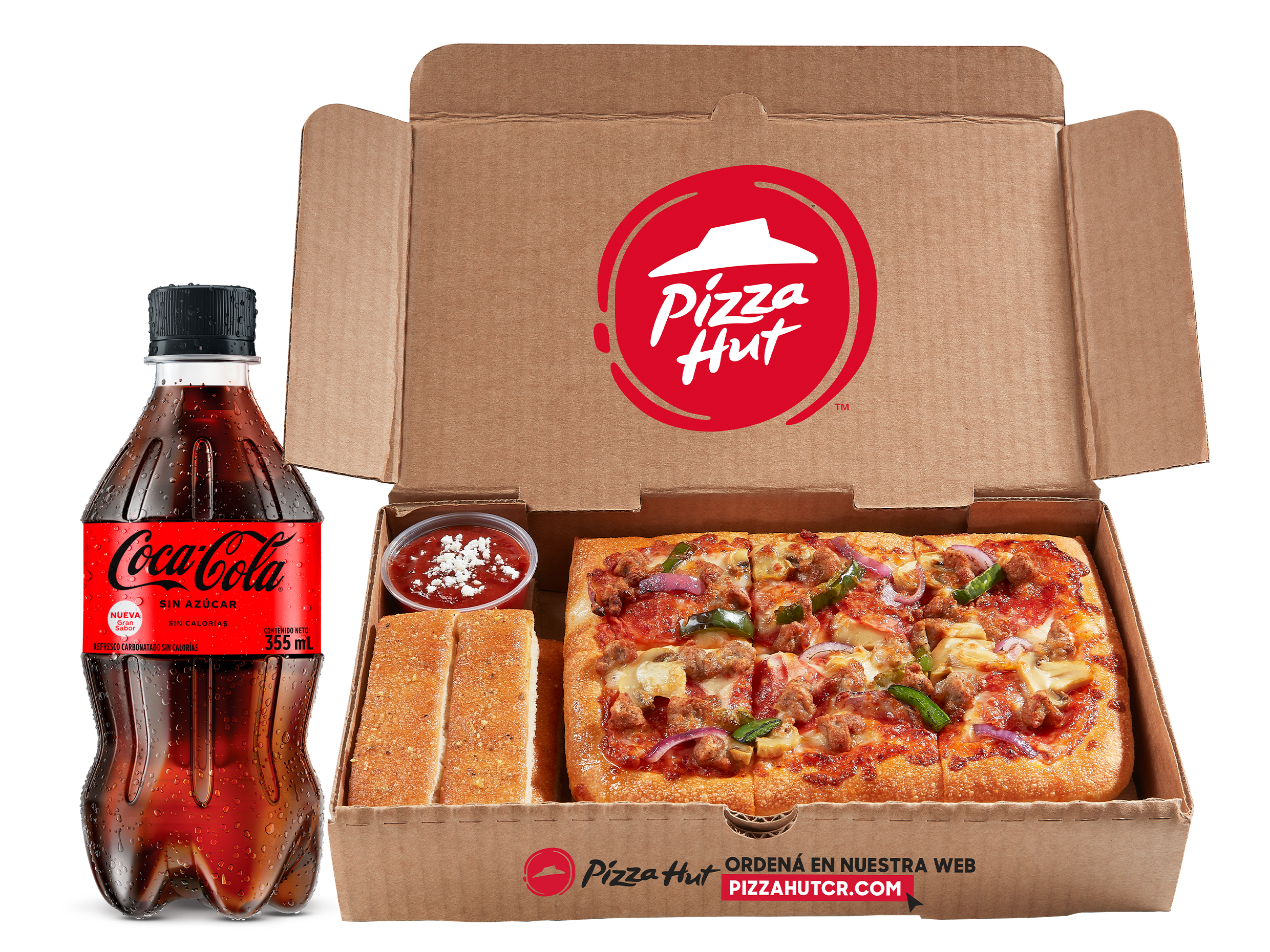 Pizza rectangular de 6 porciones, acompañada de 2 breadsticks y salsa para dippear + bebida de 355 ml.