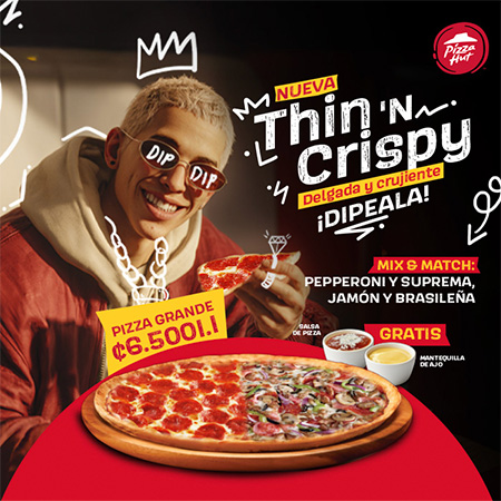 Pan Pizza: Esponjosa por dentro y crujiente por fuera. Delgada: Crujiente y deliciosa.