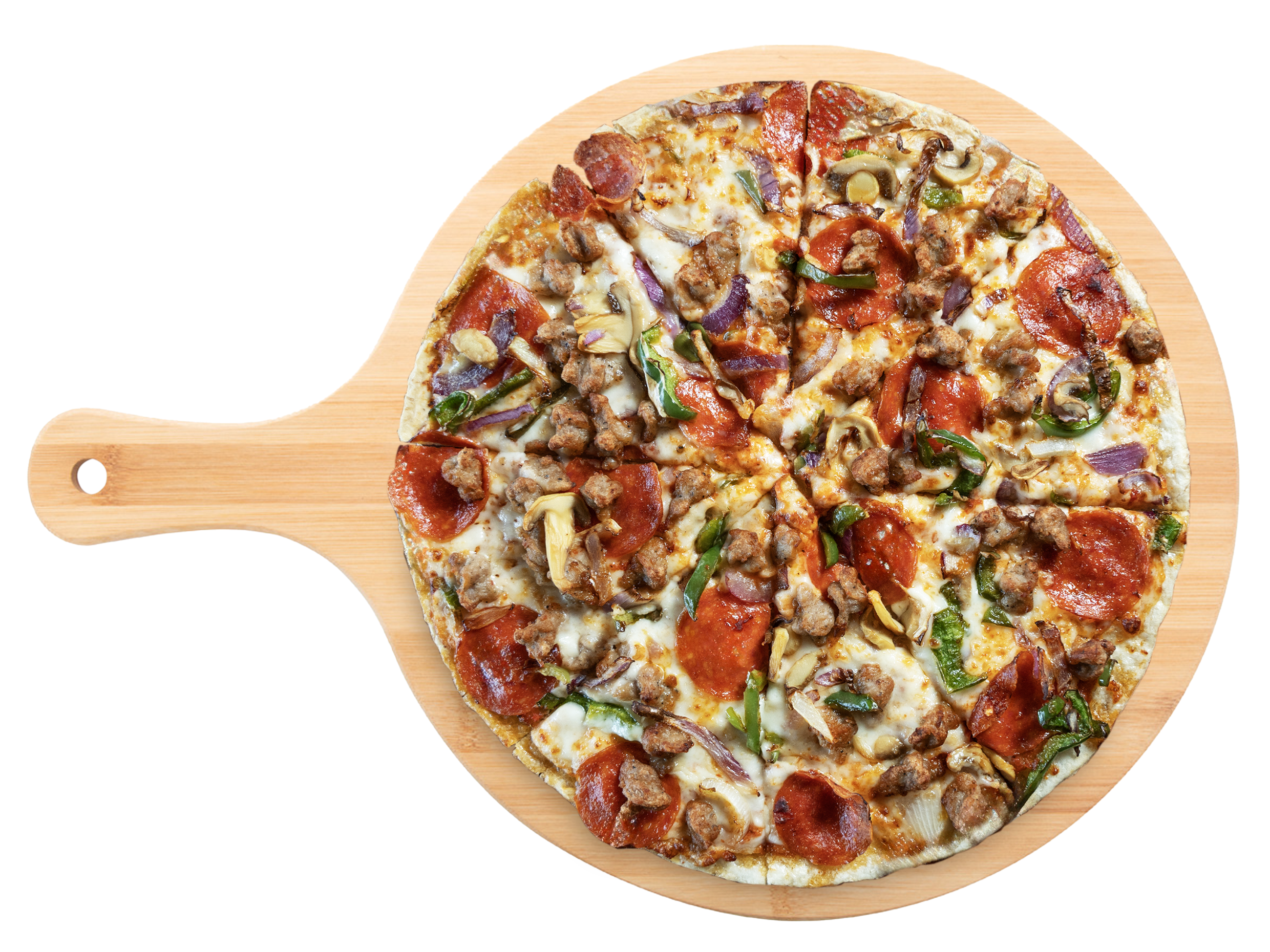 Pizza grande con masa delgada, disponible en las combinaciones: Jamón y Queso & Brasileña, y Pepperoni & Suprema. Cada pizza incluye salsitas para dippear: mantequilla de ajo y salsa pizza.