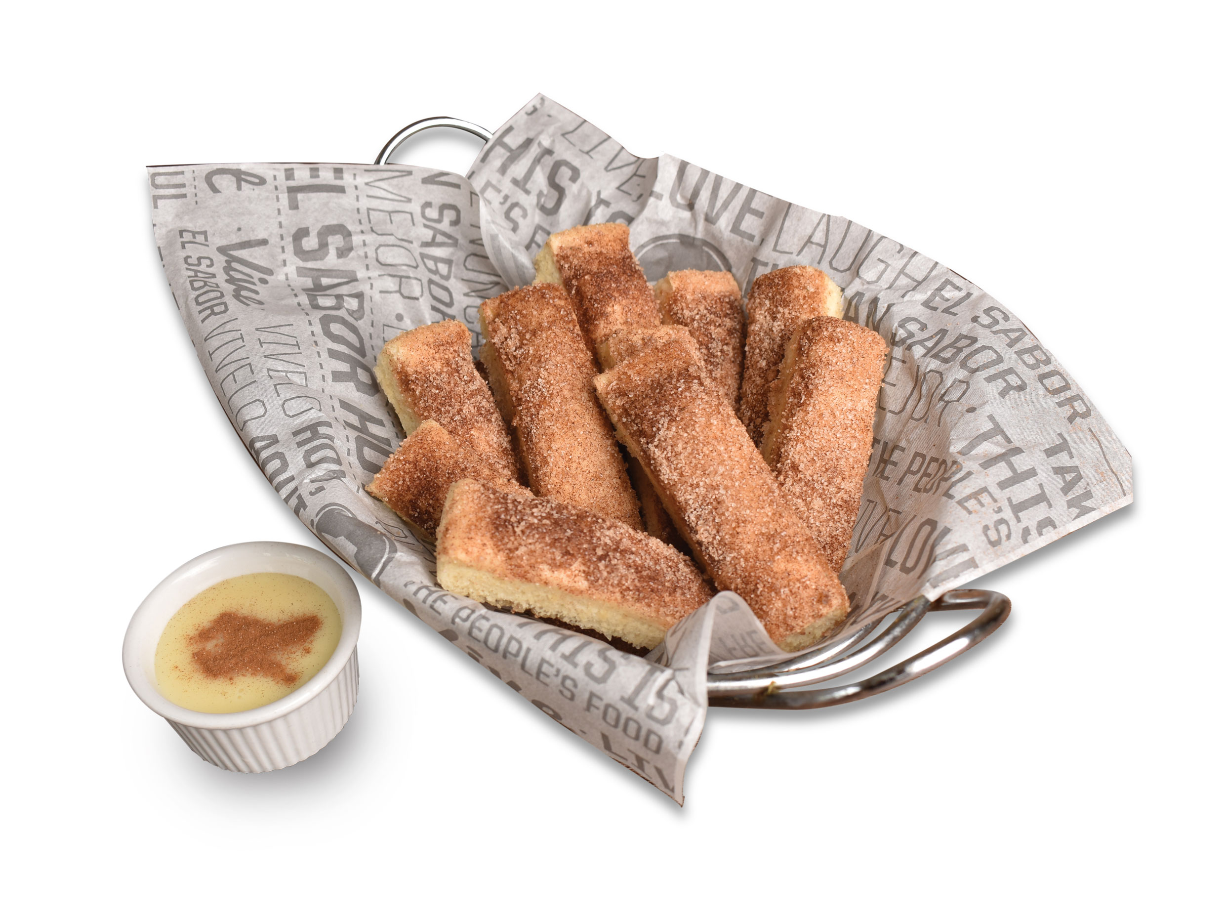 10 Palitos de pan cubiertos de azúcar y canela, acompañados de leche condensada.