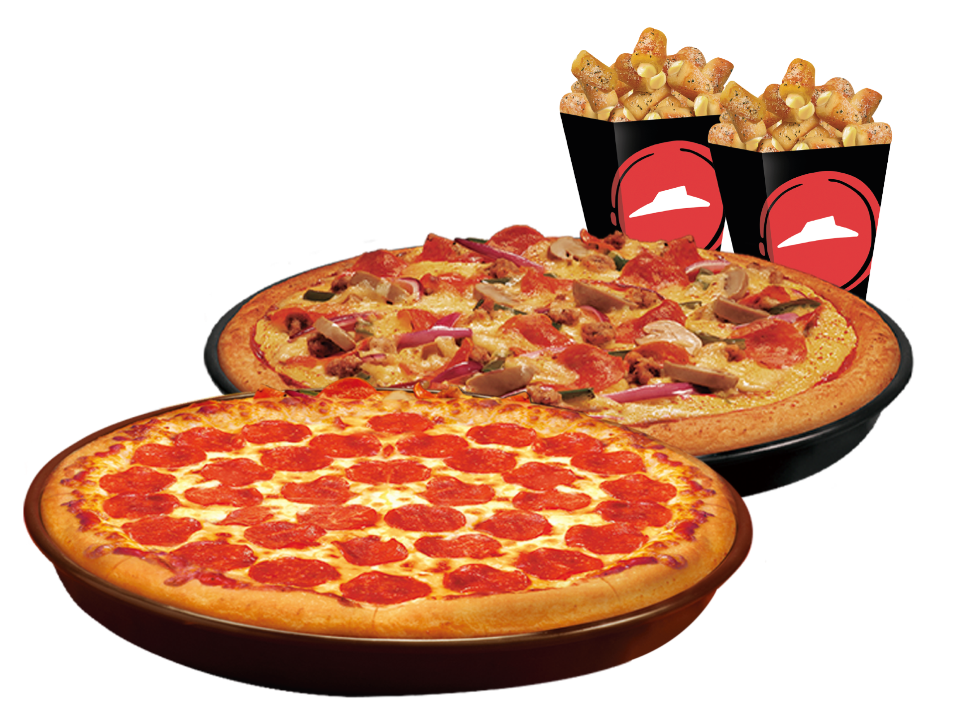 Pizza mediana, breadsticks supremos y 2 refrescos de 355ml