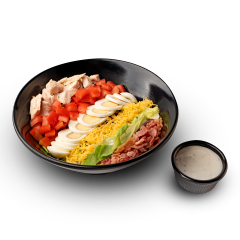 Fresca mezcla de lechugas, rodajas de huevo cocido, tomate, queso cheddar, tocineta y pollo. Acompañadas de aderezo ranch.