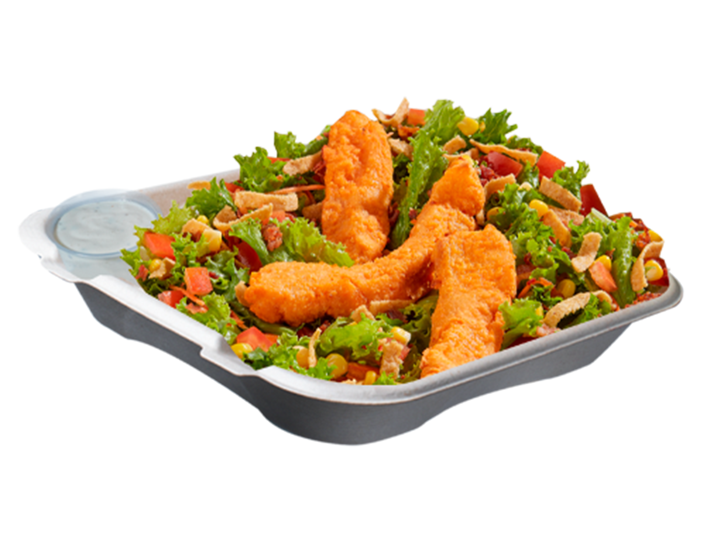 Variedad de lechugas frescas, maíz dulce, tocineta, tomate, strips de pollo y crujientes fajitas de maíz, acompañada de aderezo chipotle.