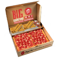 Pizza rectangular de 6 porciones, acompañada de 2 breadsticks y salsa para dippear + bebida de 355 ml.