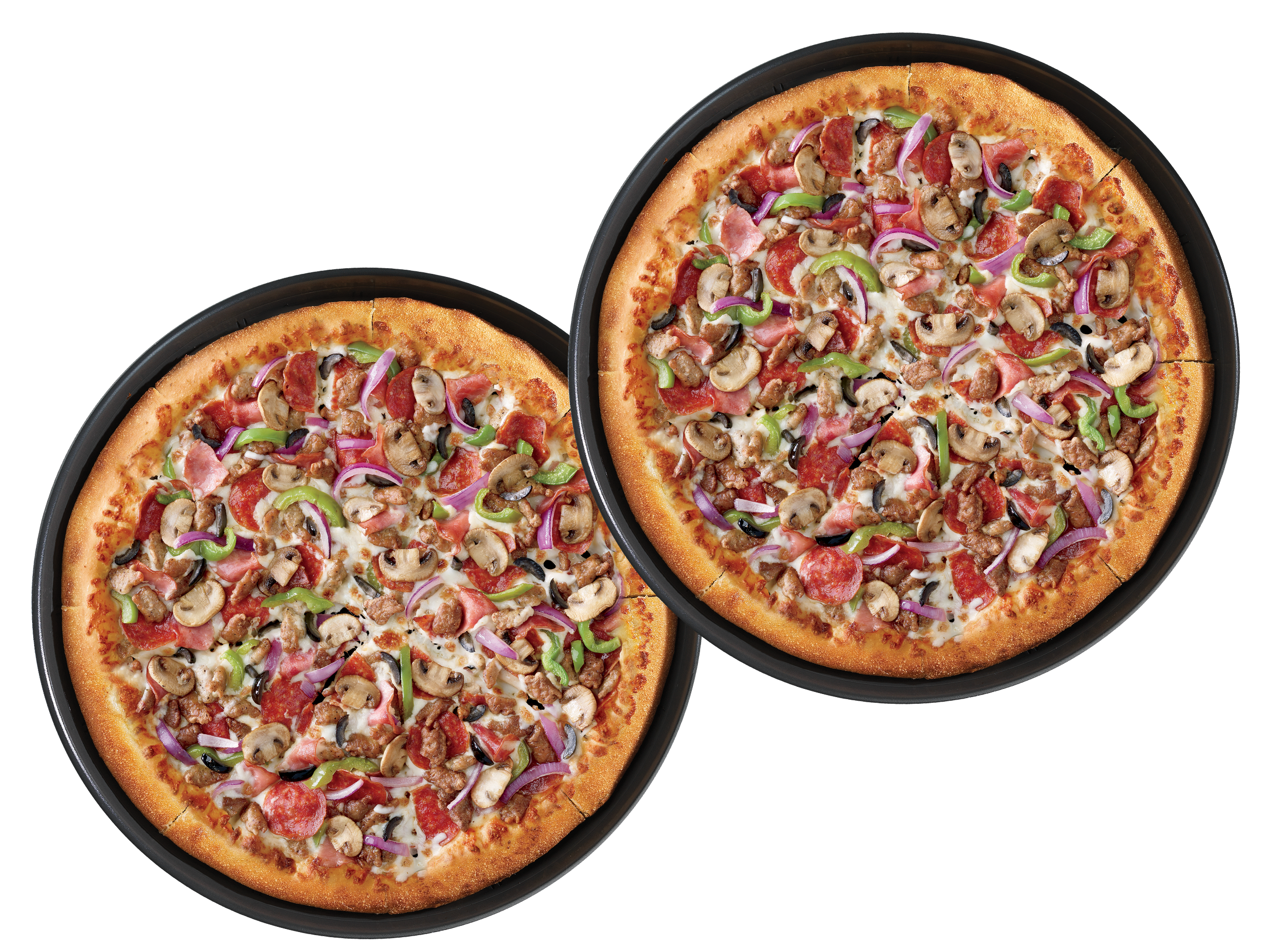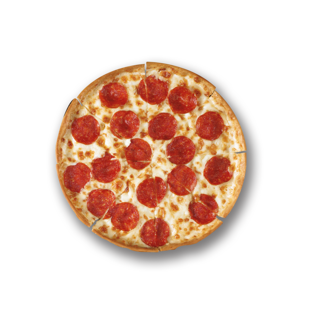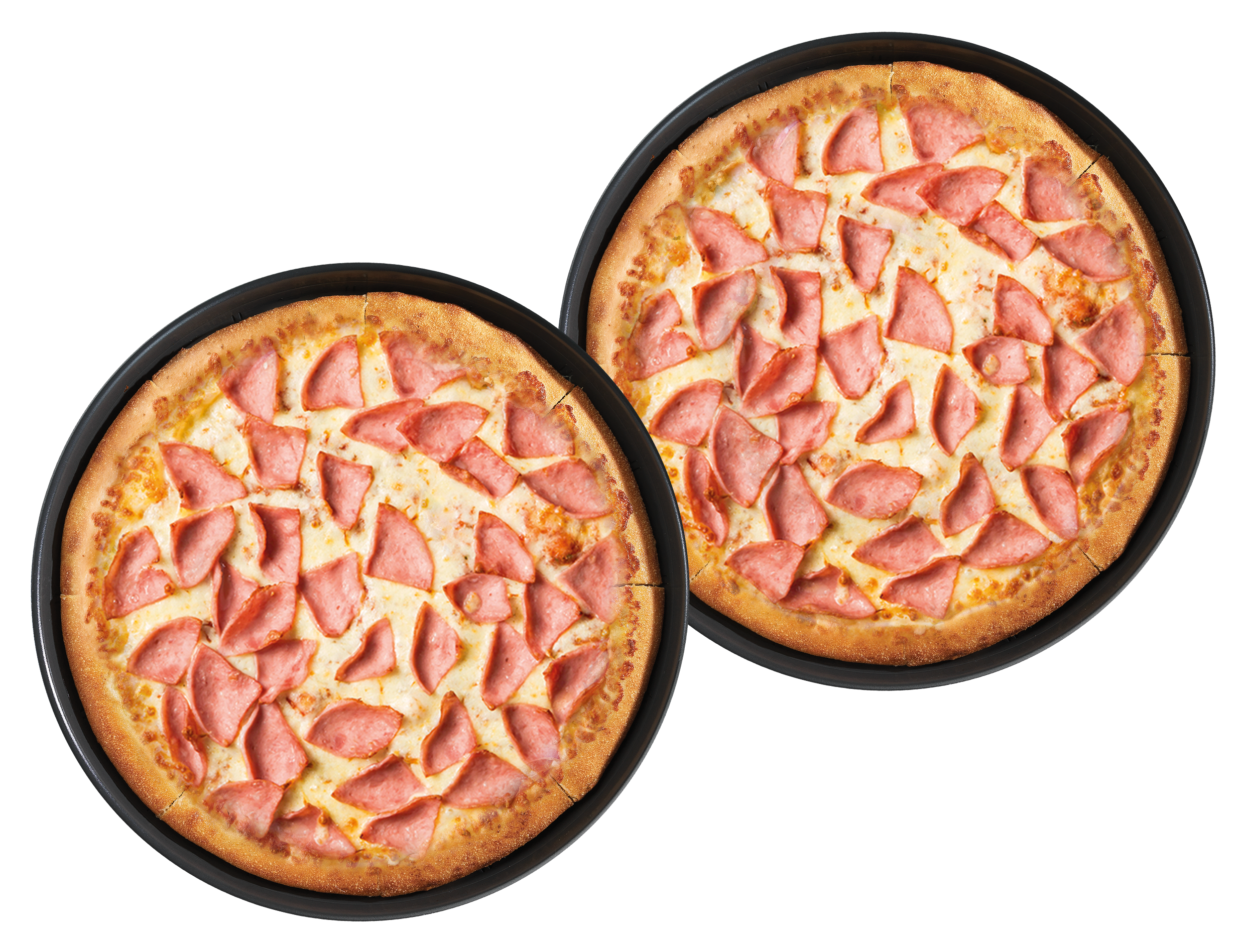 Pizza grande con masa delgada, disponible en las combinaciones: Jamón y Queso & Brasileña, y Pepperoni & Suprema. Cada pizza incluye salsitas para dippear: mantequilla de ajo y salsa pizza.