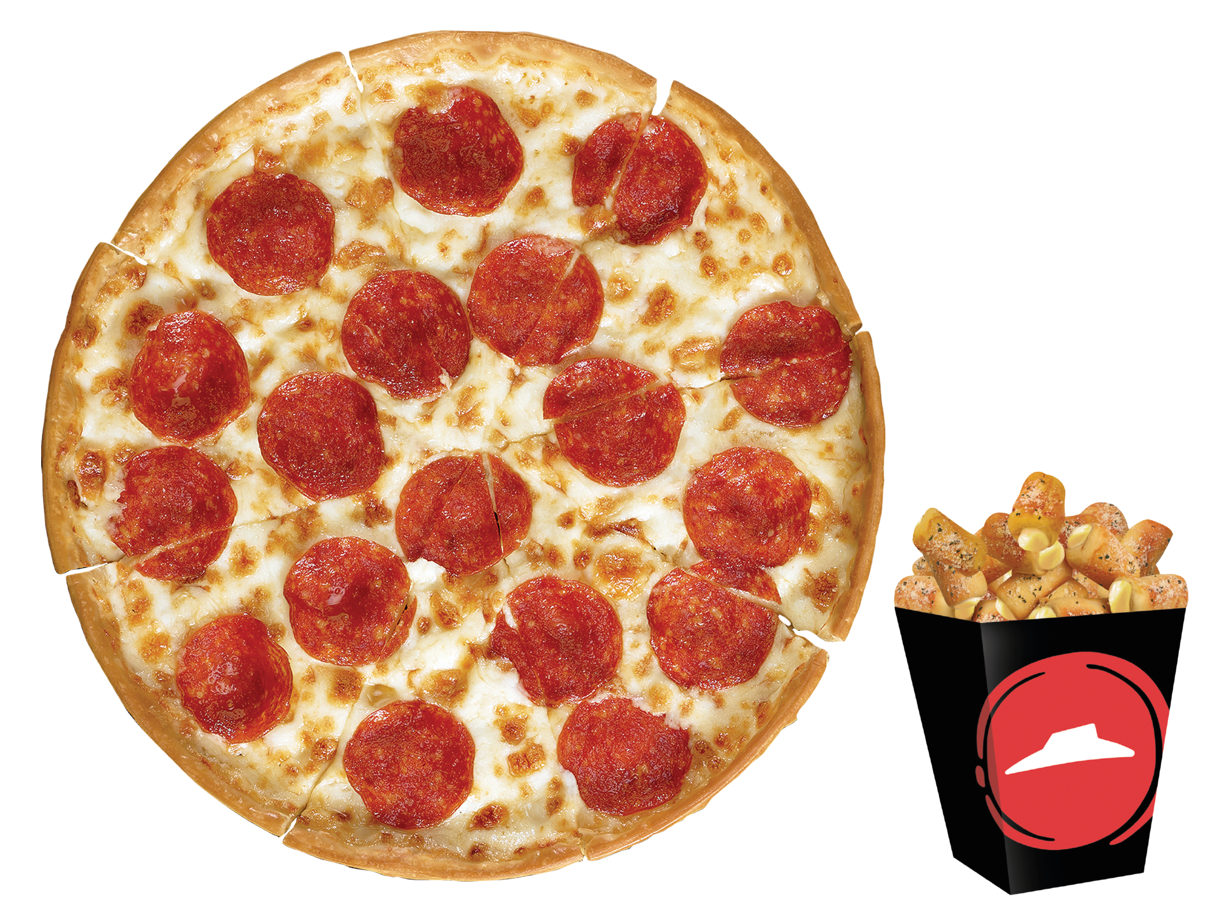 Pizza de pepperoni acompañada de 1 orden de pan de ajo y una orden de 5 Breadsticks.