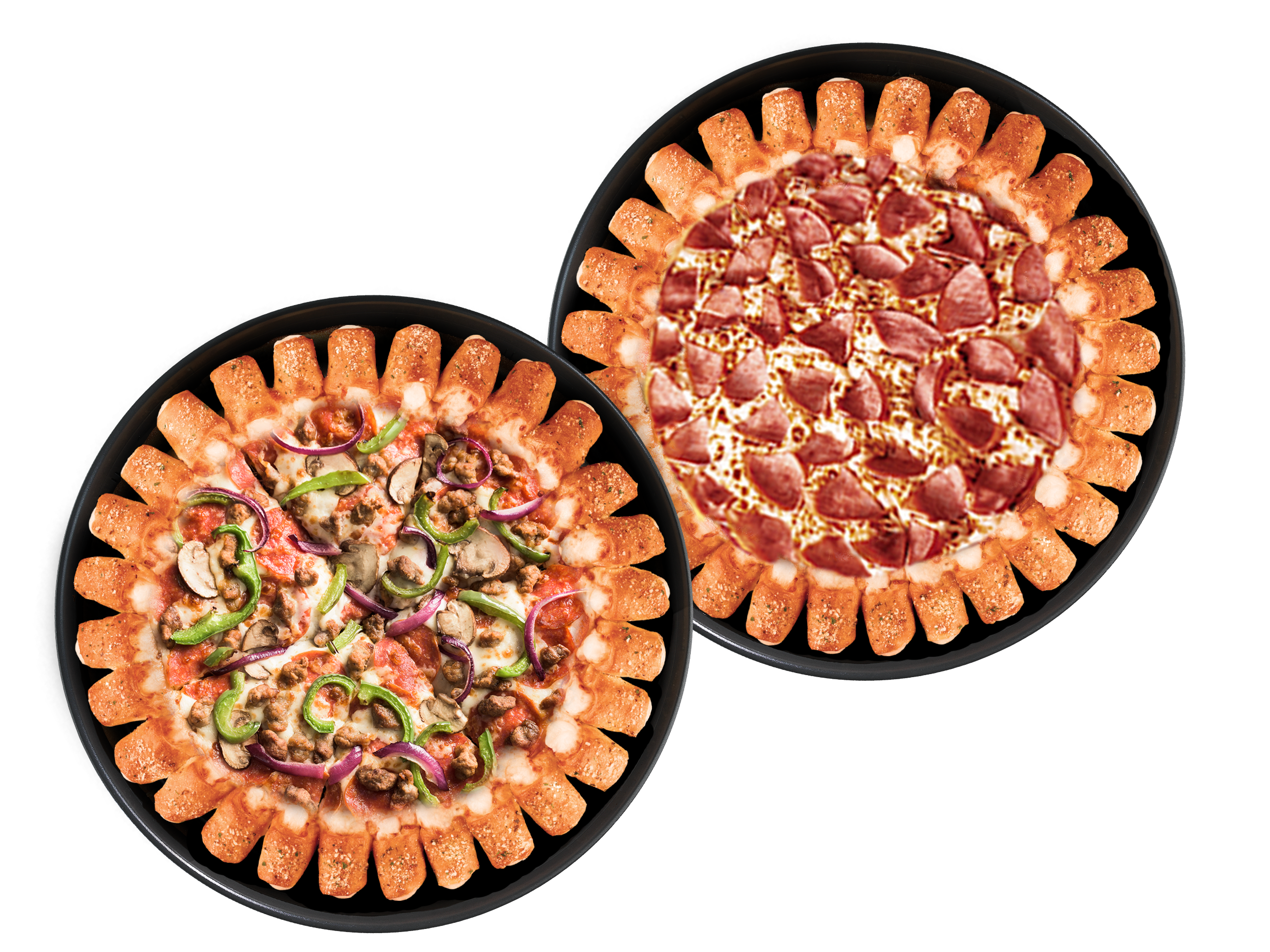 Pizza grande con masa delgada, disponible en las combinaciones: Jamón y Queso & Brasileña, y Pepperoni & Suprema. Cada pizza incluye salsitas para dippear: mantequilla de ajo y salsa pizza.