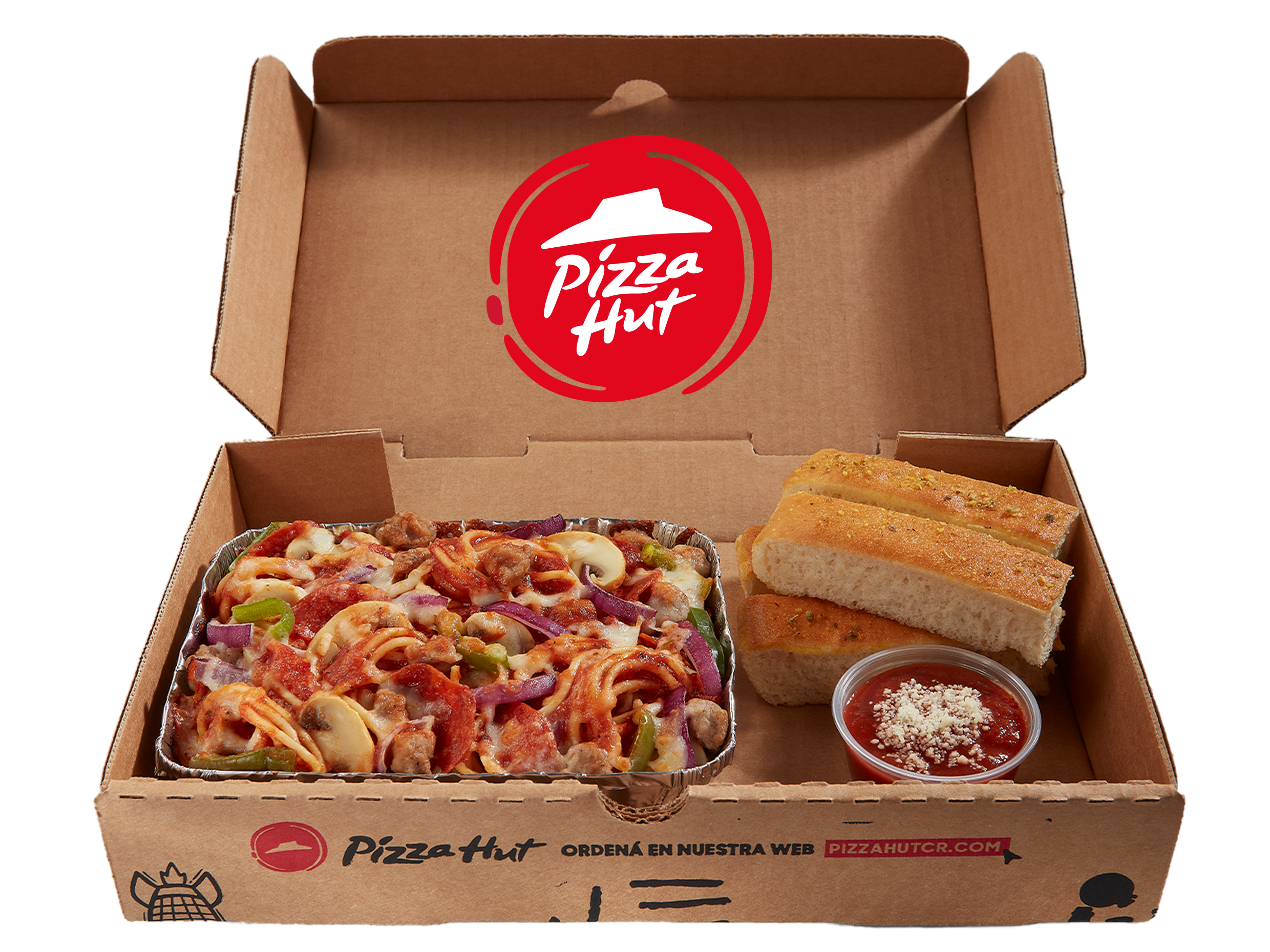 Pizza rectangular de 6 porciones, acompañada de 2 breadsticks y salsa para dippear + bebida de 355 ml.