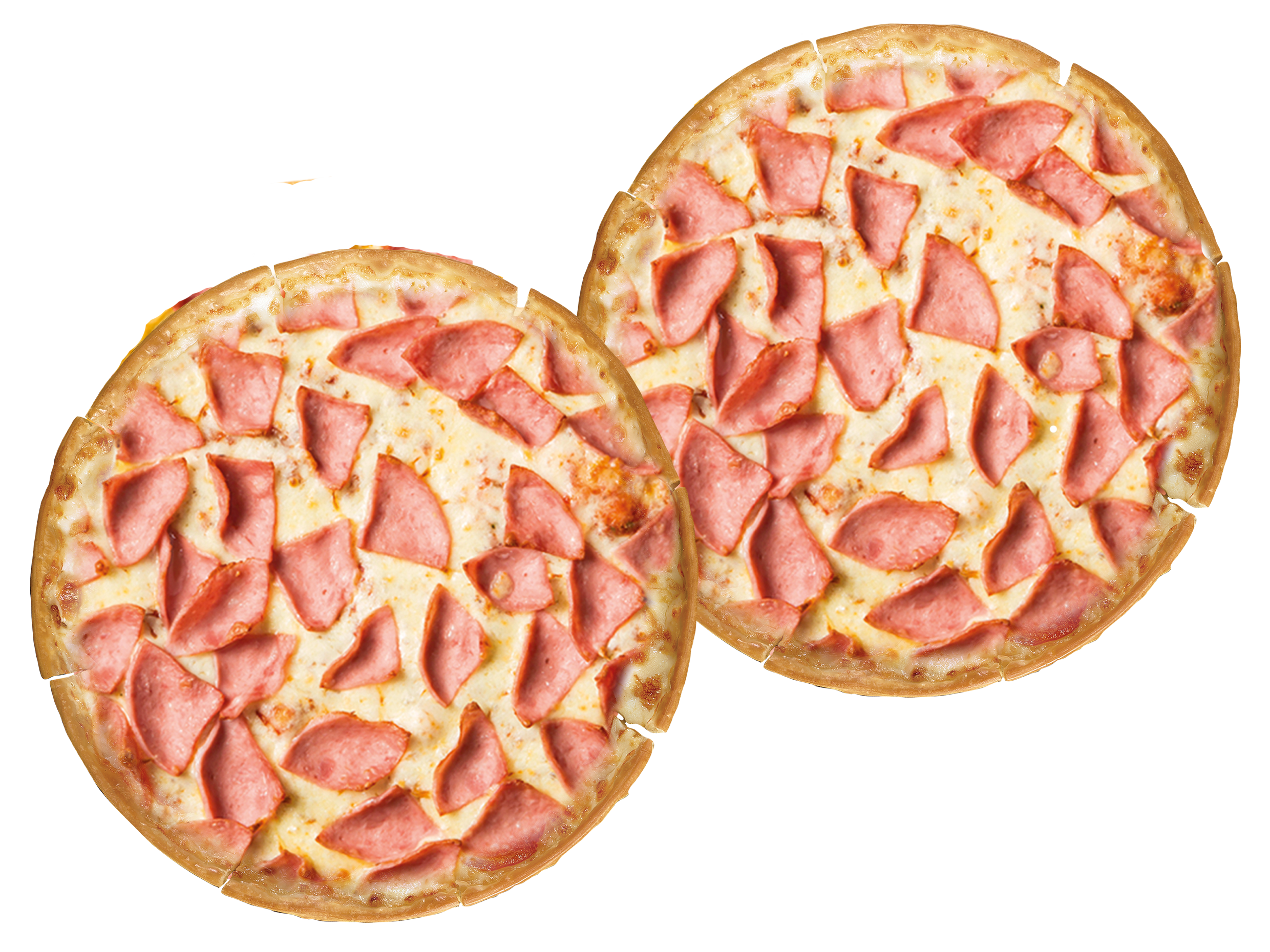 Disfruta dos deliciosas pizzas grandes de 14". Sabor jamón o pepperoni. Masa artesanal. 10 Slices.