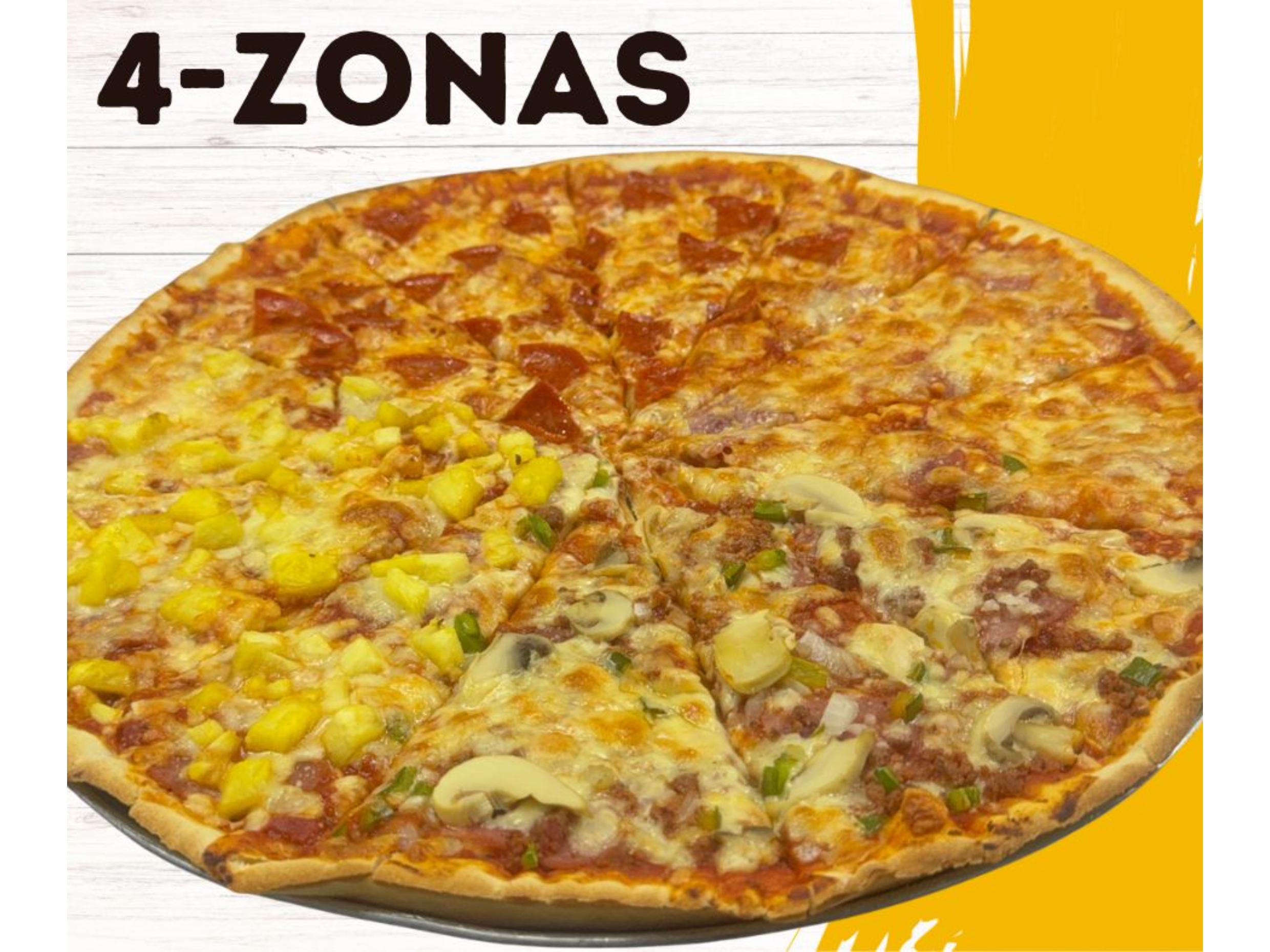 4-Zonas (4 sabores en tu misma pizza) Suprema/jamón y queso/hawaiana/Peperoni. 14 pulgadas y 8 pedazos.
