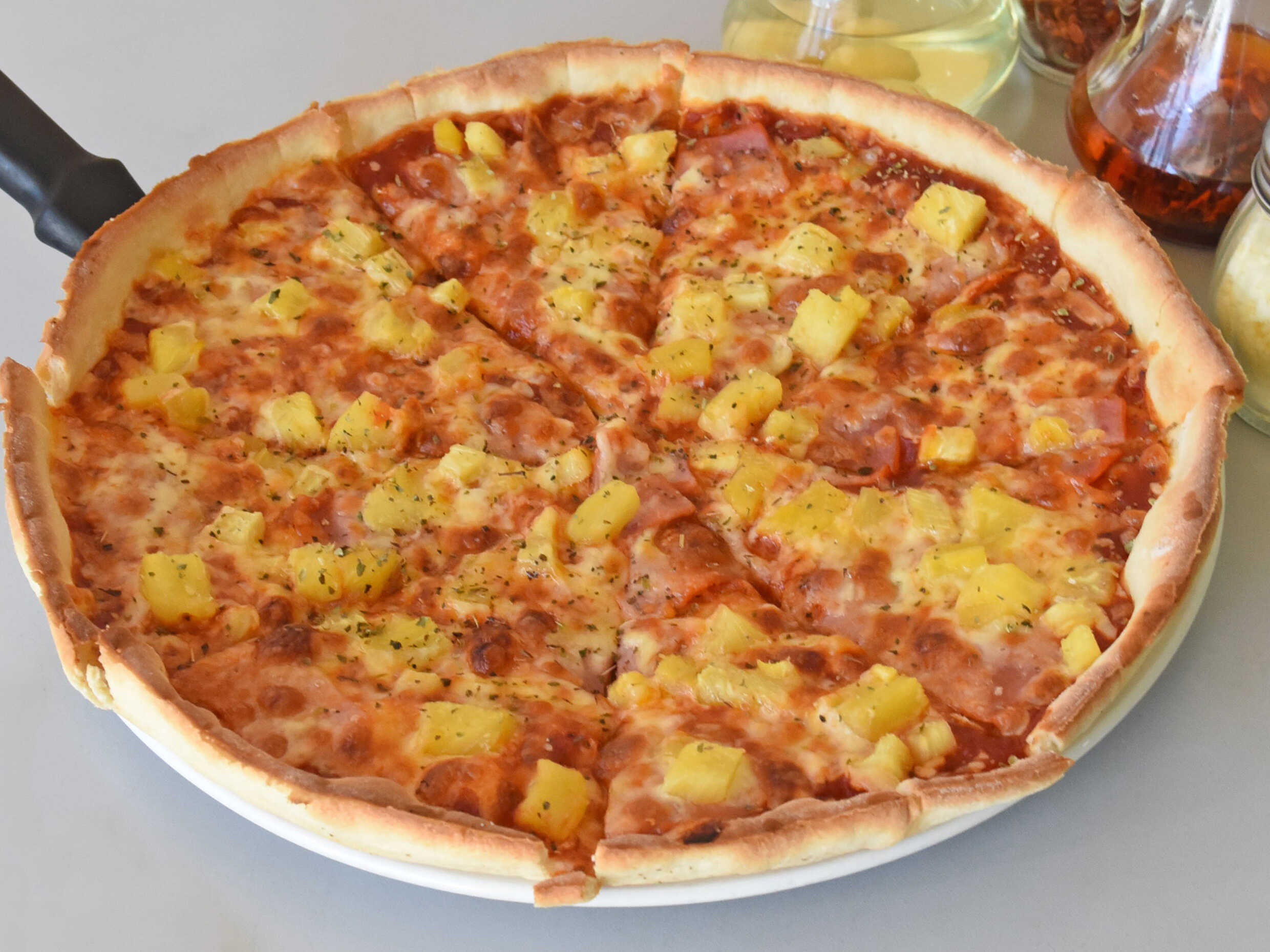 Salsa de pizza, jamón, queso mozzarella y trozos de piña.
