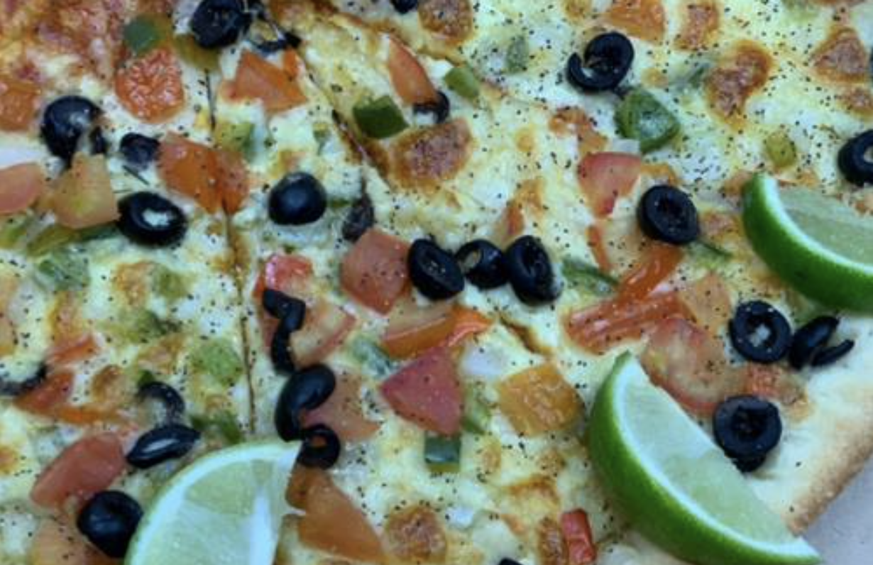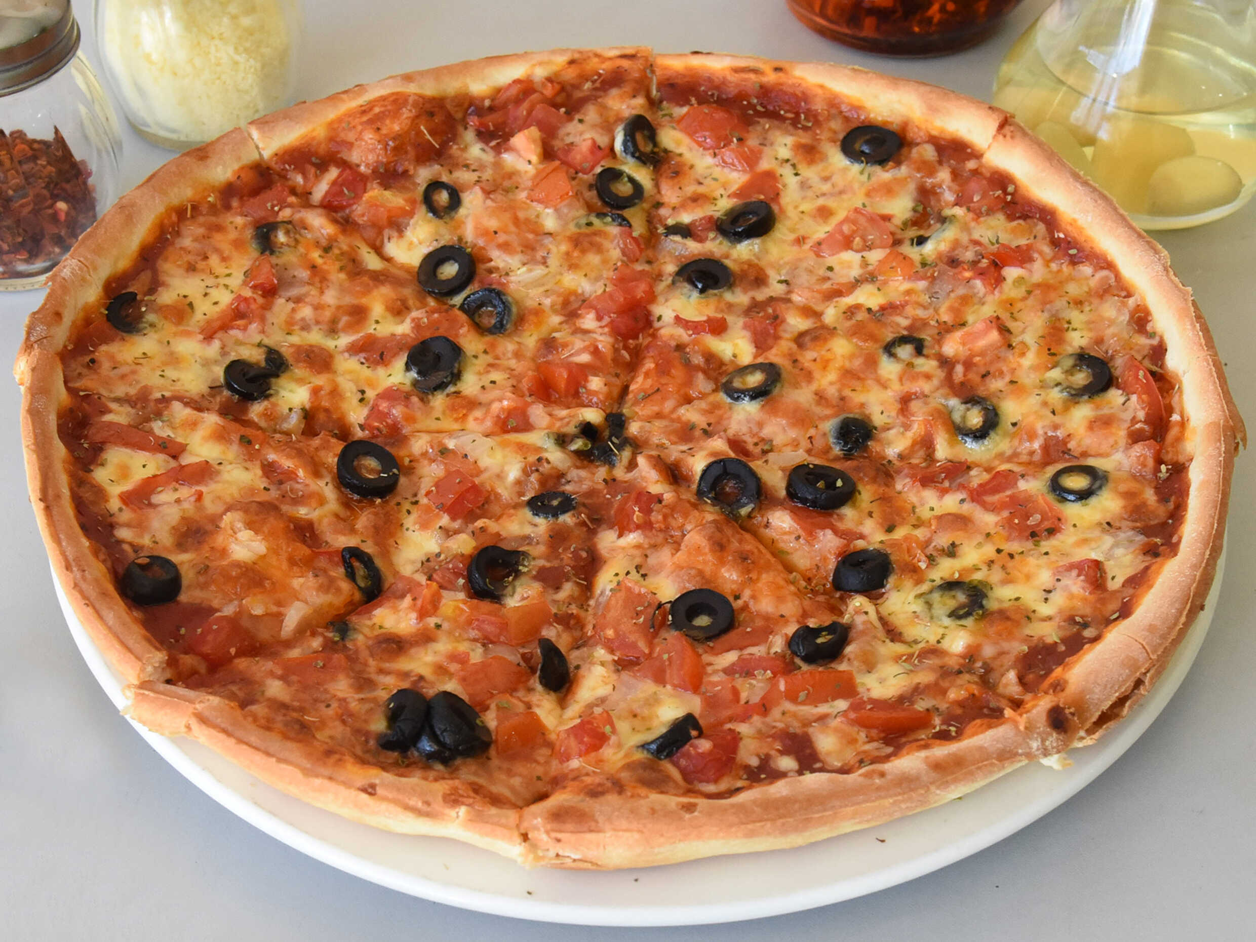 Salsa de pizza, cebolla, chile dulce, queso mozzarella, aceitunas negras y tomate picado.