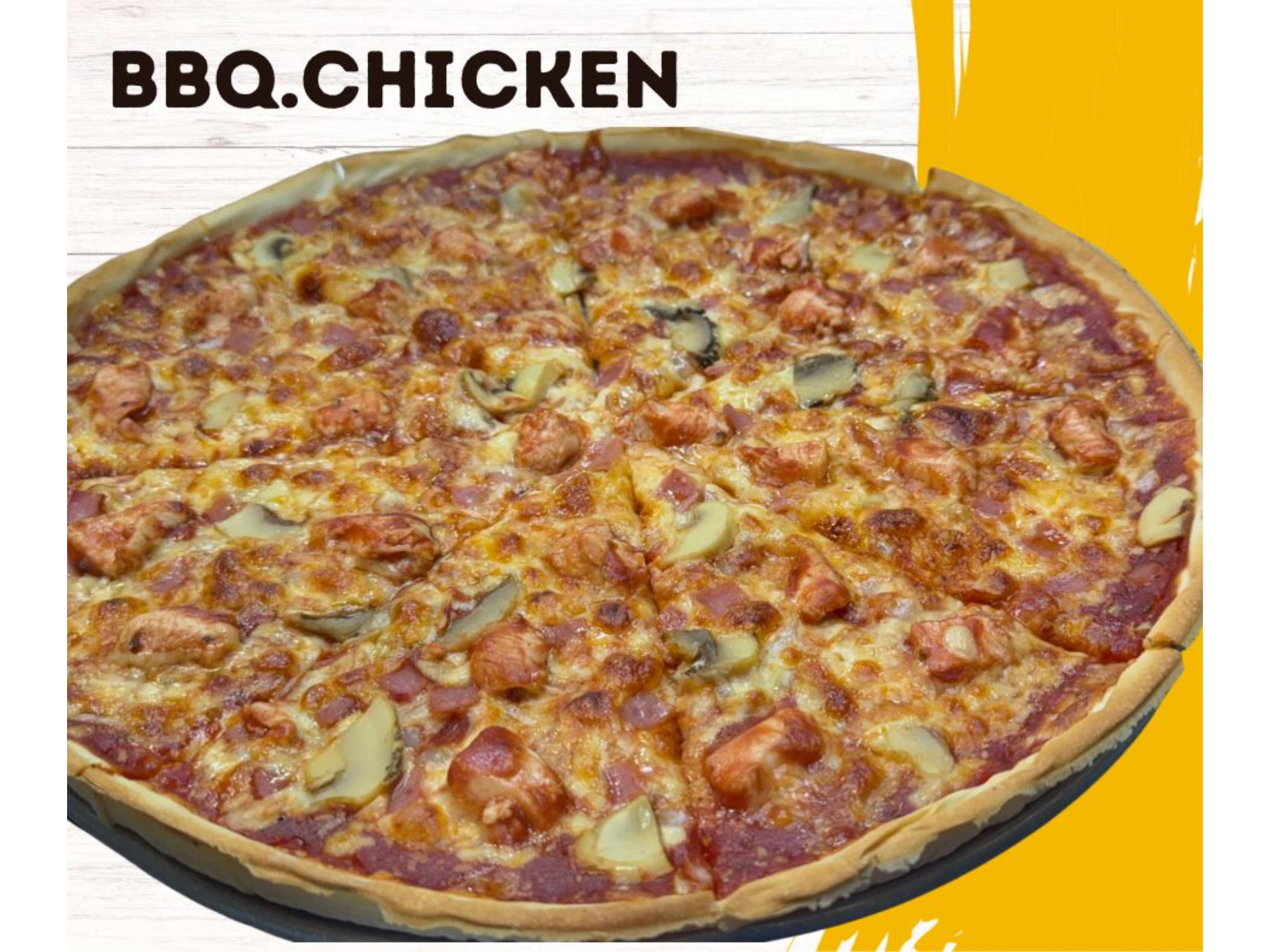 Salsa BBQ, cebolla, Mozarella,pollo BBQ,tocineta y hongos. 14 pulgadas y 8 pedazos.