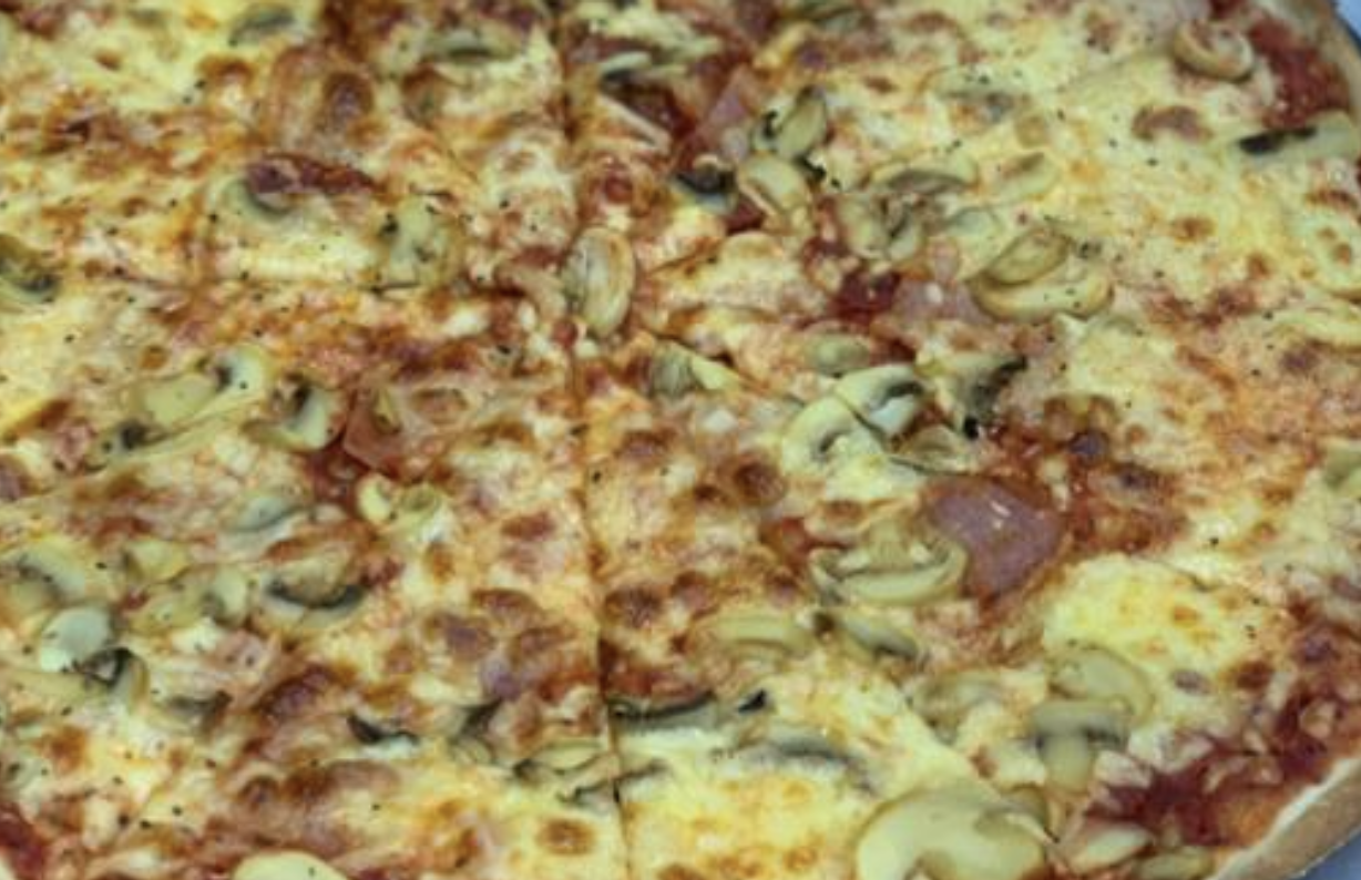 Salsa de pizza, jamón, cebolla, chile dulce, carne molida, queso mozzarella y hongos.
