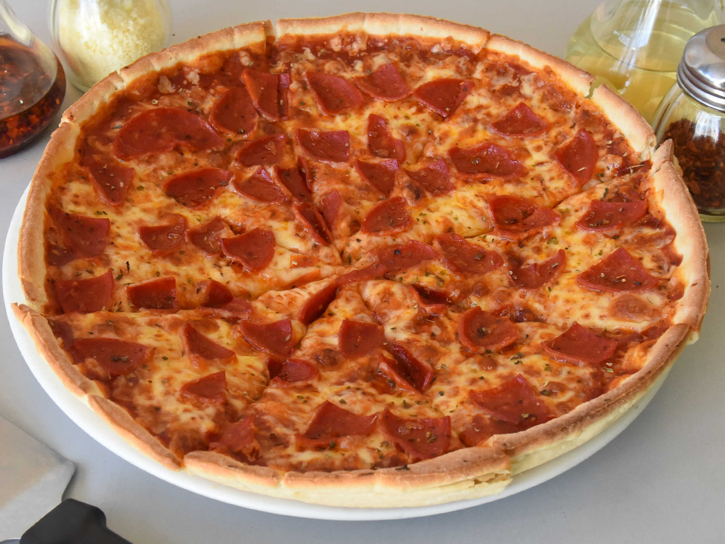 Salsa de pizza, queso mozzarella y pepperoni. 14 pulgadas, 8 pedazos.