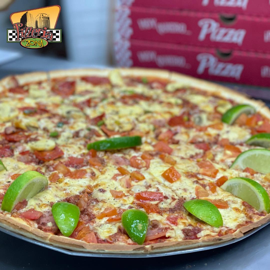 Salsa de pizza, jamón, carne molida, queso mozzarella, tomate picado, acompañada de rodajas de limón.
