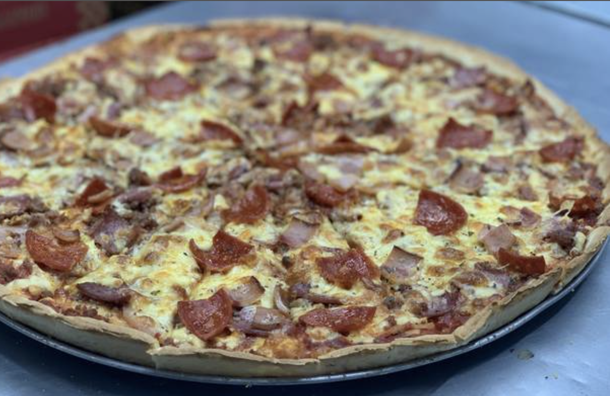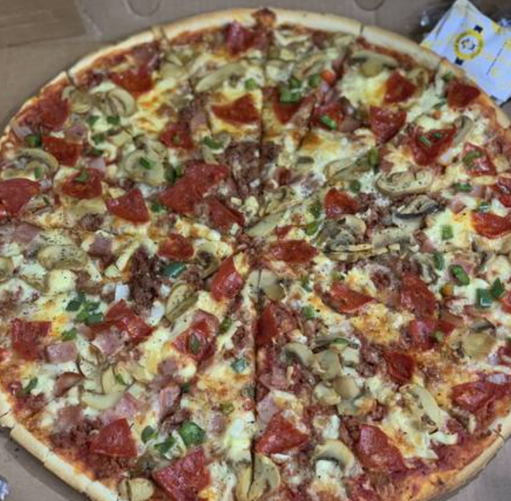 Salsa de pizza, jamón, cebolla, chile dulce, carne molida, queso mozzarella, tocineta, hongos y peperoni. 14 pulgadas, 8 pedazos.