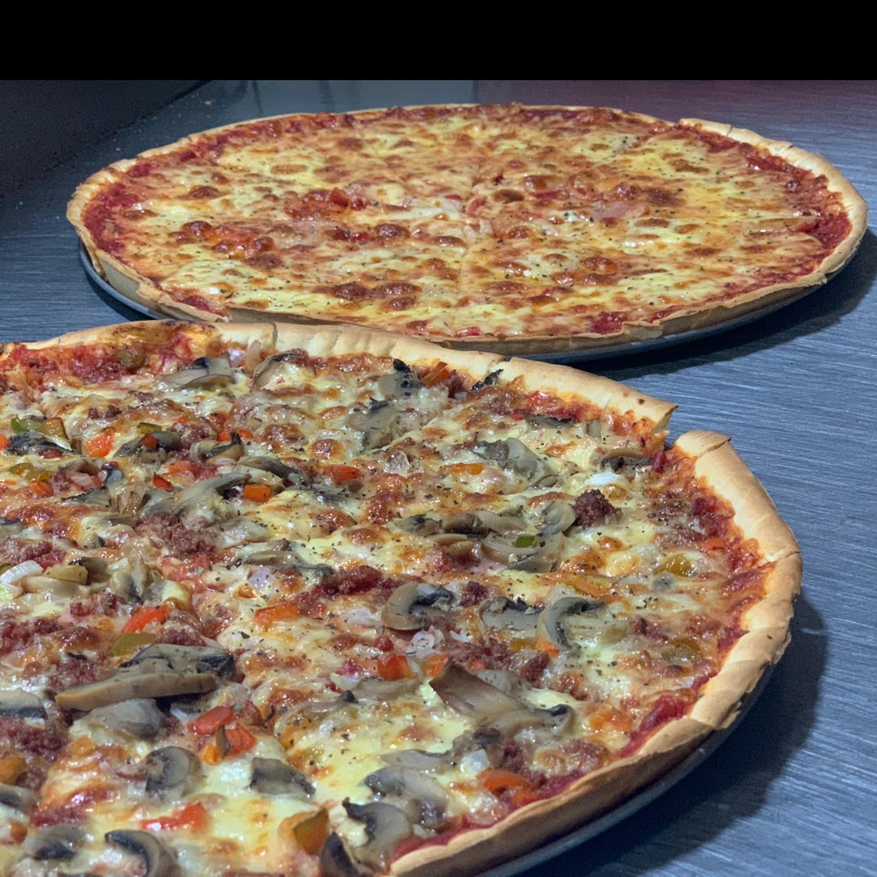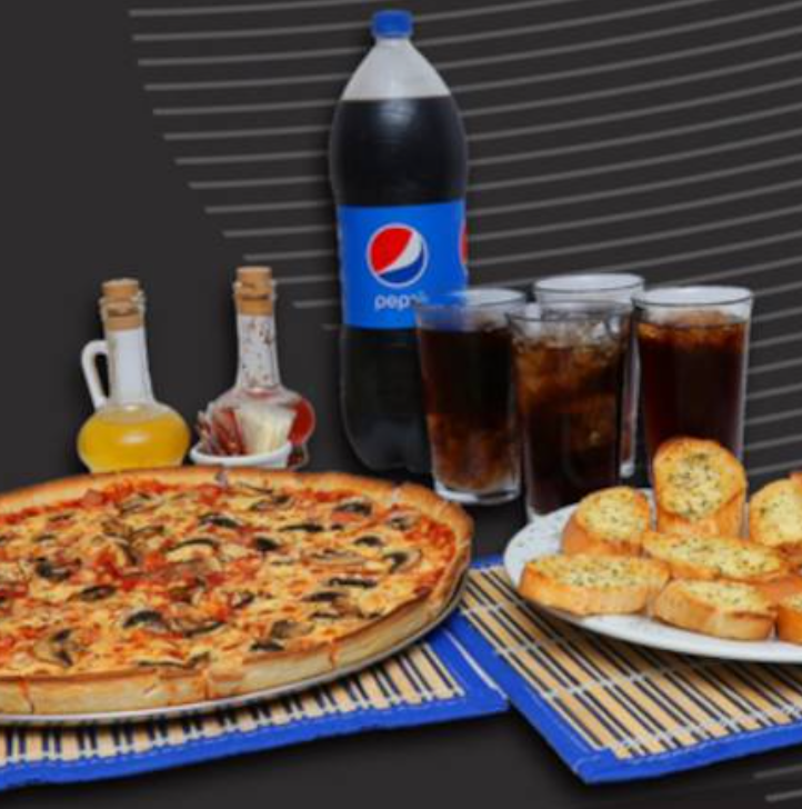 Pizza gigante con sabor a elegir más 3 órdenes de pan de ajo más Coca Cola de 1.5 L.