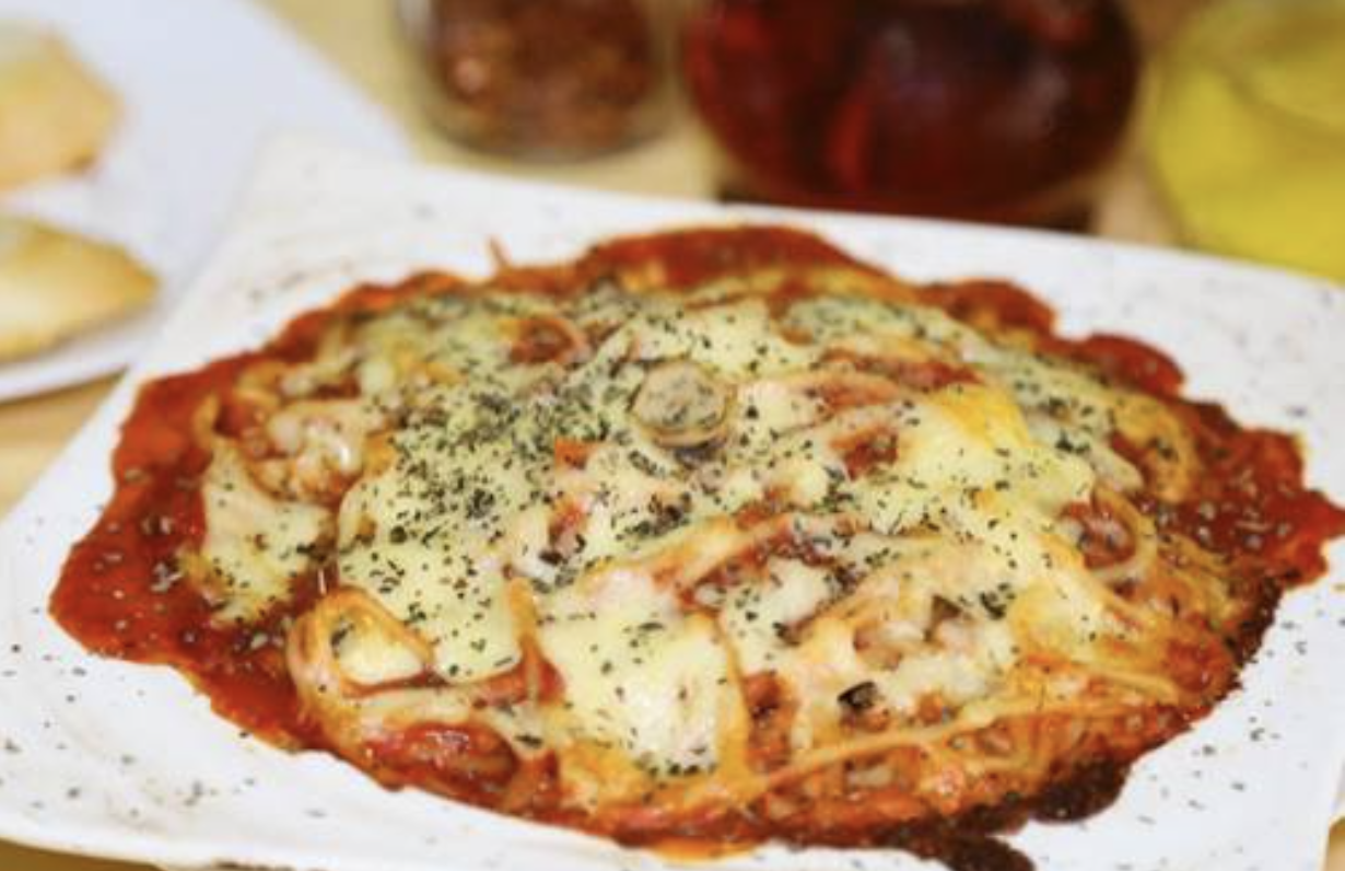 Espagueti, salsa, cebolla, tocineta, hongos y queso.