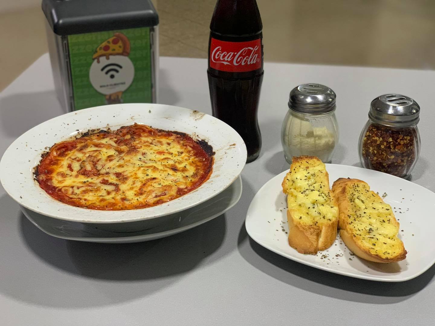 Espagueti, salsa, jamón, cebolla, chile dulce, carne molida, queso mozzarella , acompañado de pan de ajo.