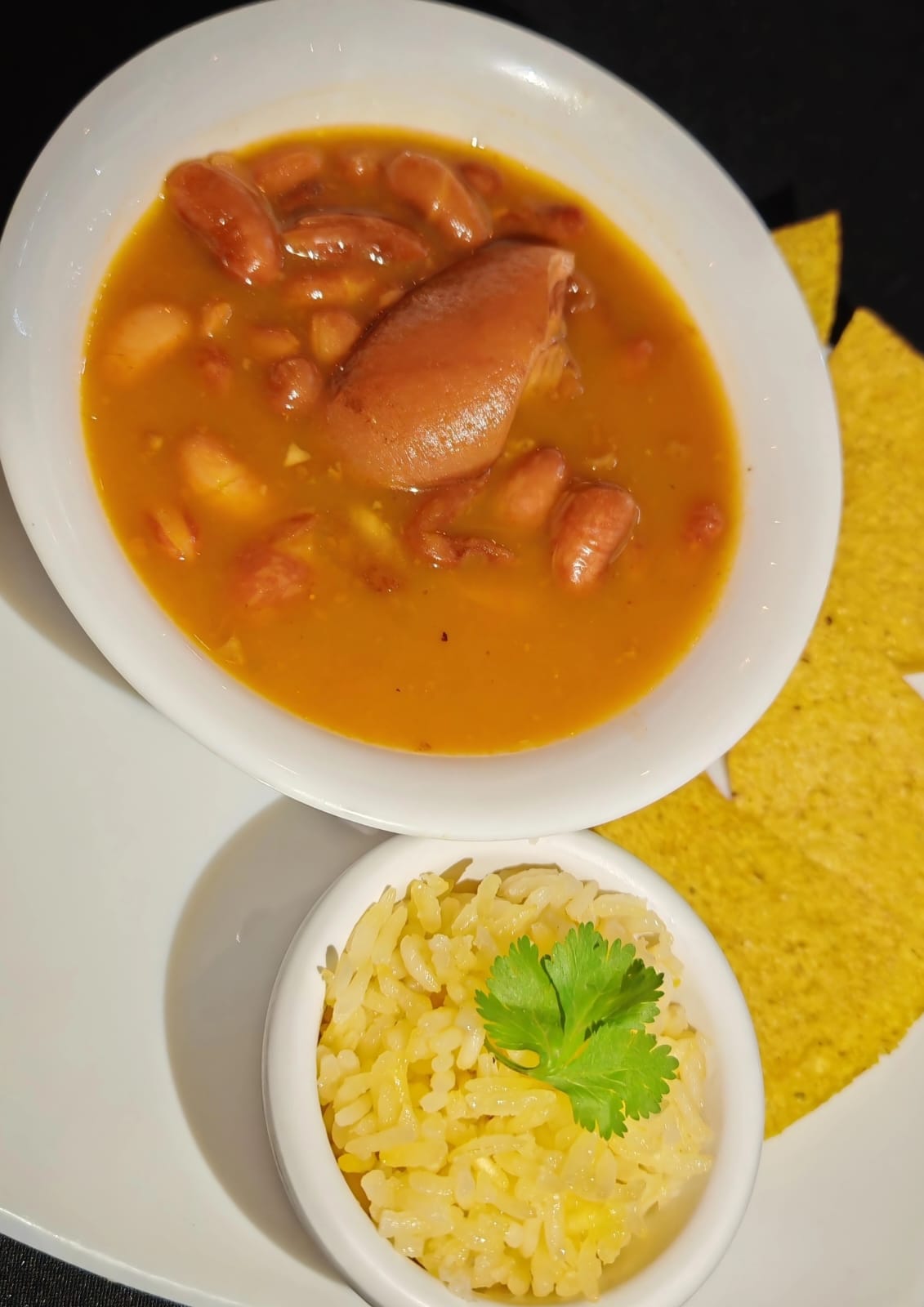 6 alitas de pollo, 250 gr de costilla al horno, 250 gr de chicharrones de jugosa carne, orden de carne desmechada, orden . frijoles con queso, orden de pico de gallo, tortillas, patacones, yuca frita ,limones y salsas.