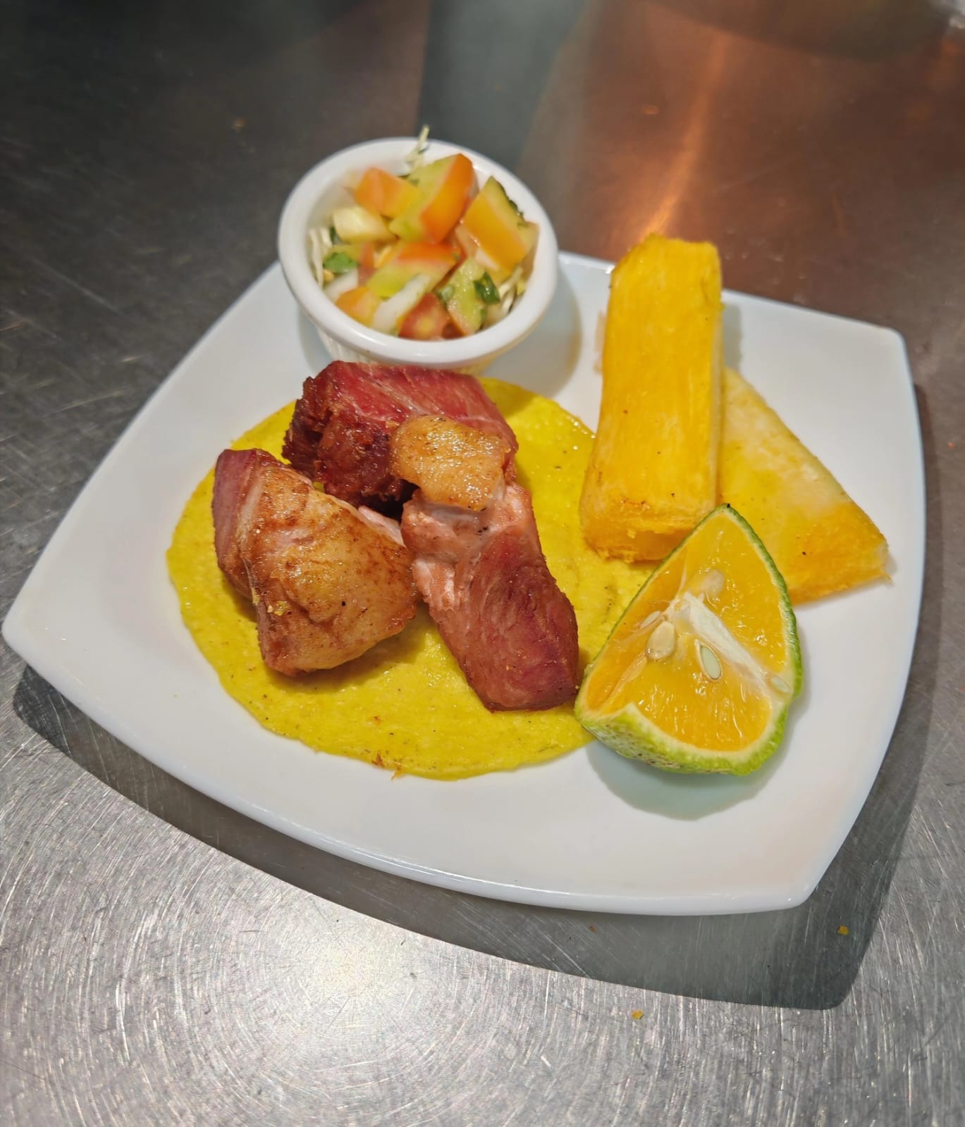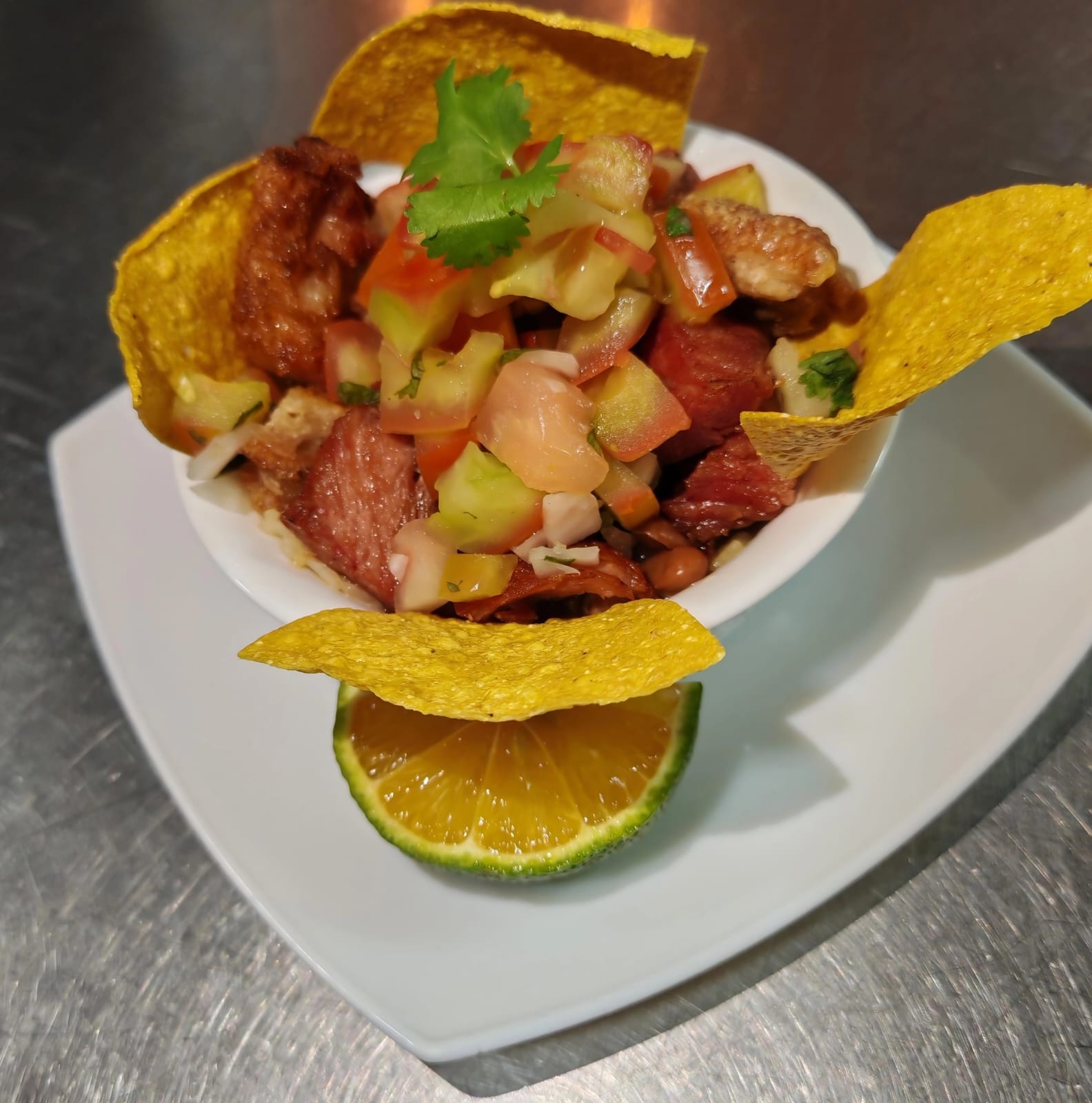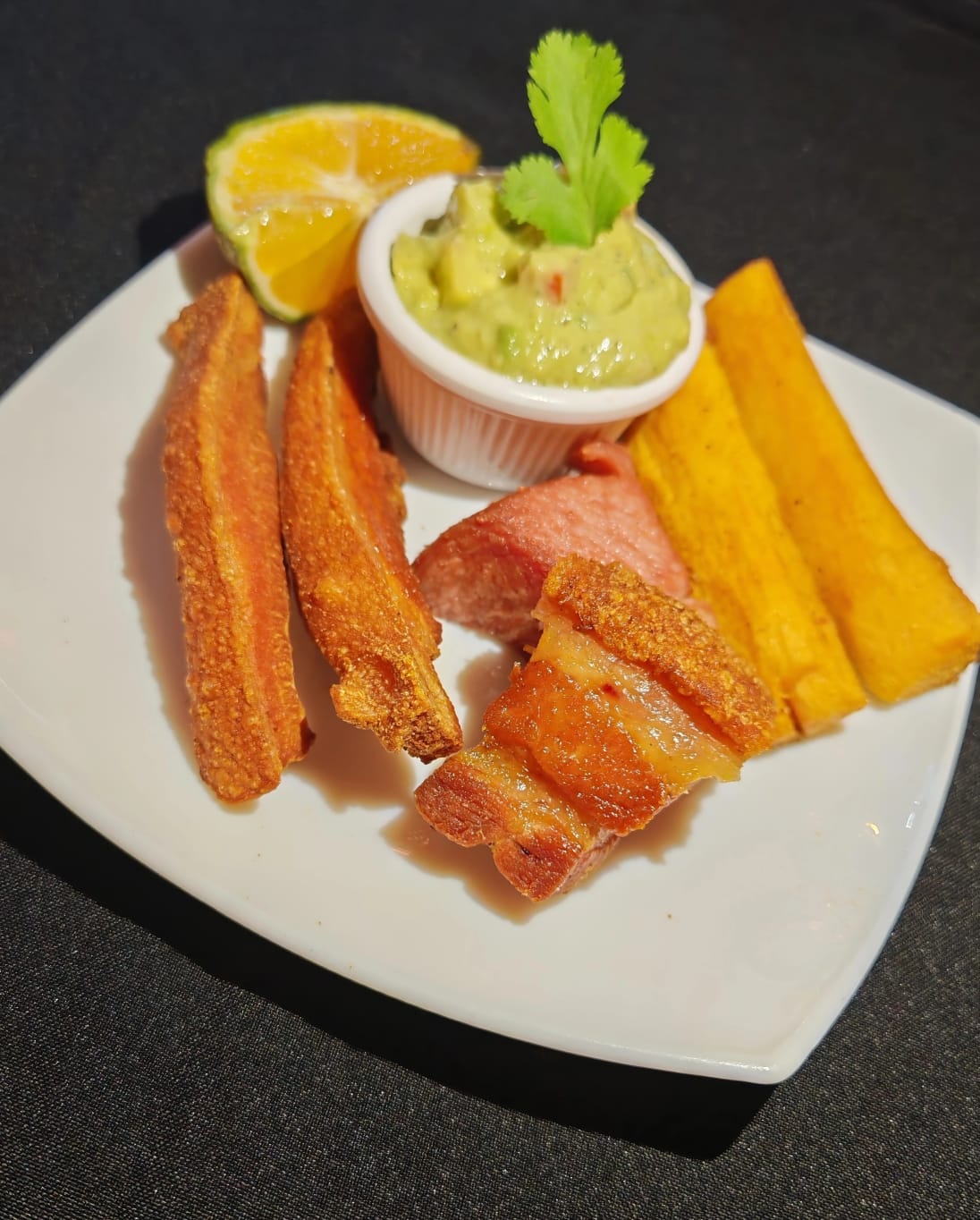 1/2 kg. de exquisitos chicharrones de pura carne, acompañado de yuca frita, tortillas, limón y pico de gallo.