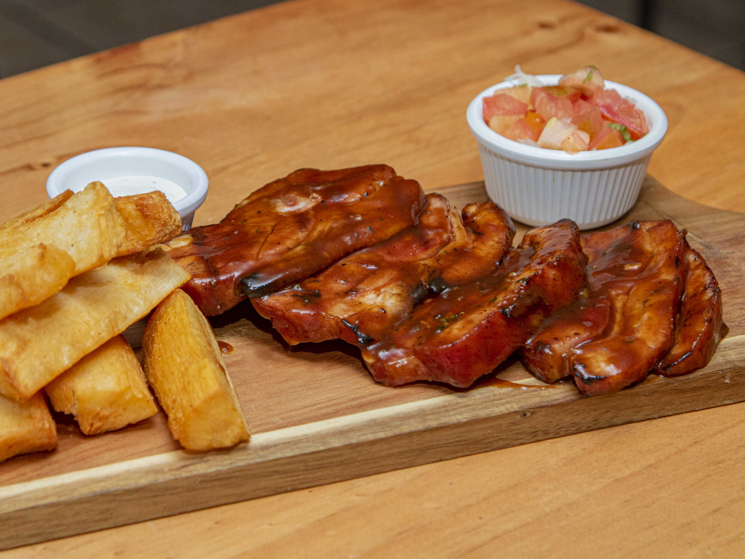 Aprox.1/2 kilo de costillita de cerdo marcada a la parrilla. -Bañada en nuestra única y artesanal salsa BBQ o Spicy BBQ. -Crujiente yuca frita. -Pico de gallo. -Aderezo ranch.