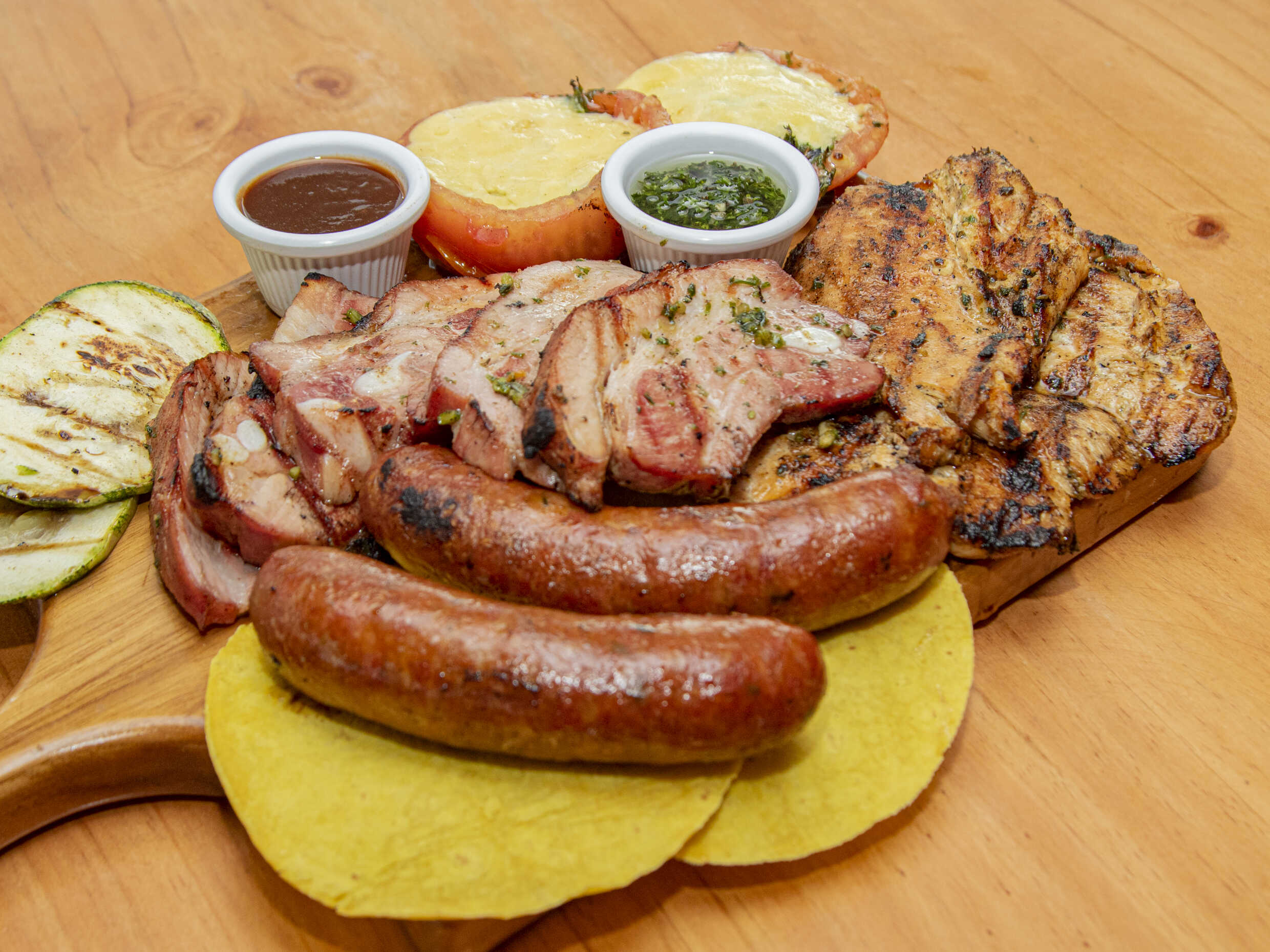 Exquisita costillita planet al horno pasada por la parrilla con salsa BBQ de la casa,chicharrón de carne,dos jugosos choricitos de la casa,todo a la parrilla,acompañado de dos tortillitas suaves,yuquitas fritas,pico de gallo,aderezo ranch y aji de la casa(el aji debes de solicitarlo)