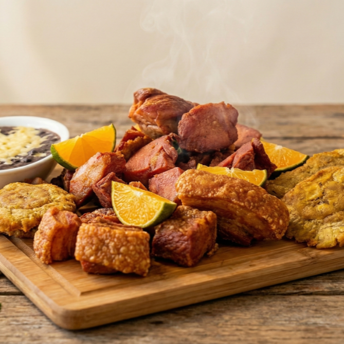 Orden gigante de chicharrones, tortillitas de maíz, yuquitas fritas, papitas fritas, orden grande de frijolitos molidos con queso, ensalada criolla, tortillitas chips, limón, aderezo ranch y ají planet.