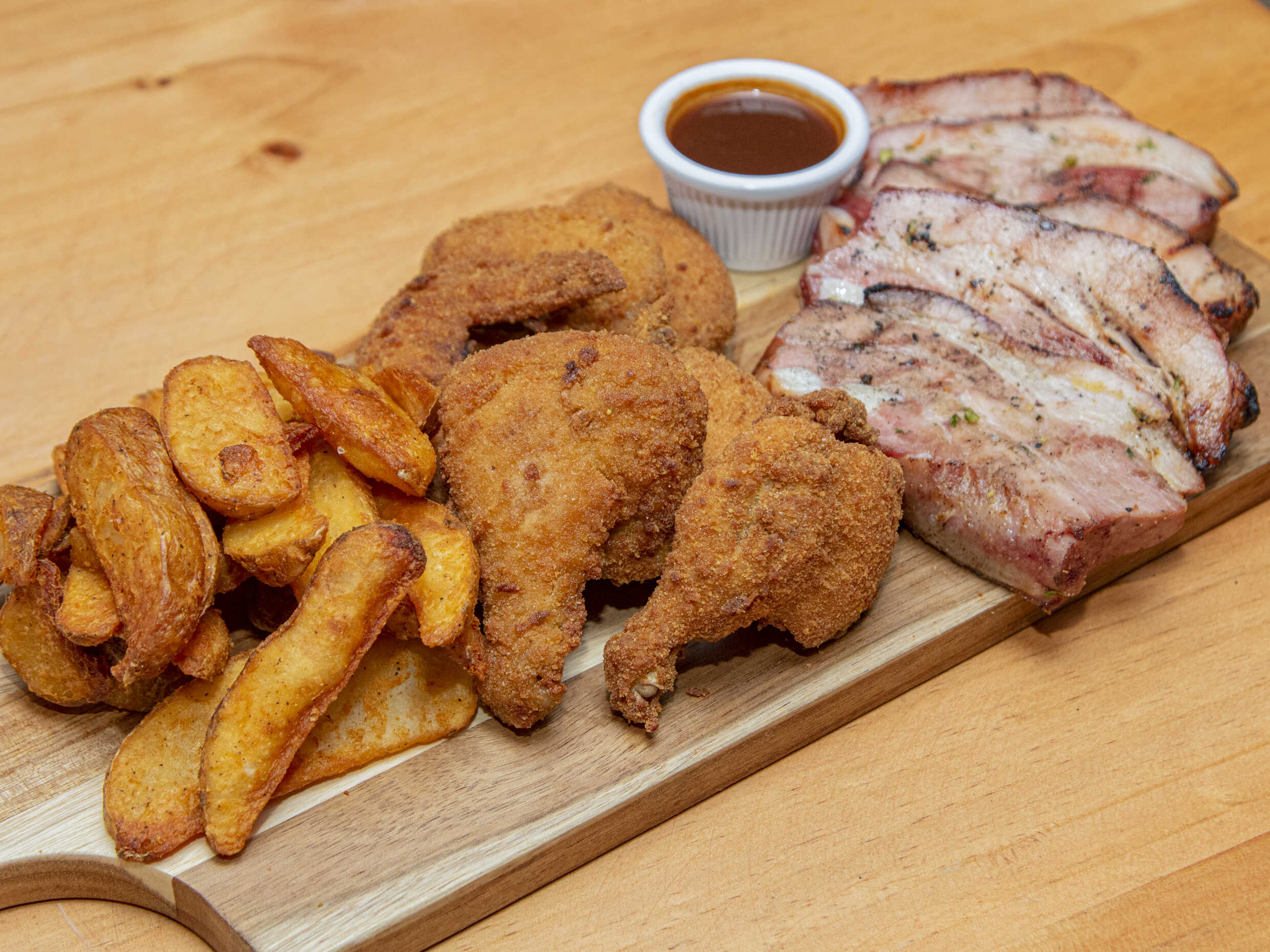 6 alitas de pollo empanizadas,costillita de cerdo a la parrilla bañadas en nuestra unica y artesanal salsa BBQ acompañada de papitas campesinas fritas y aderezos varios.