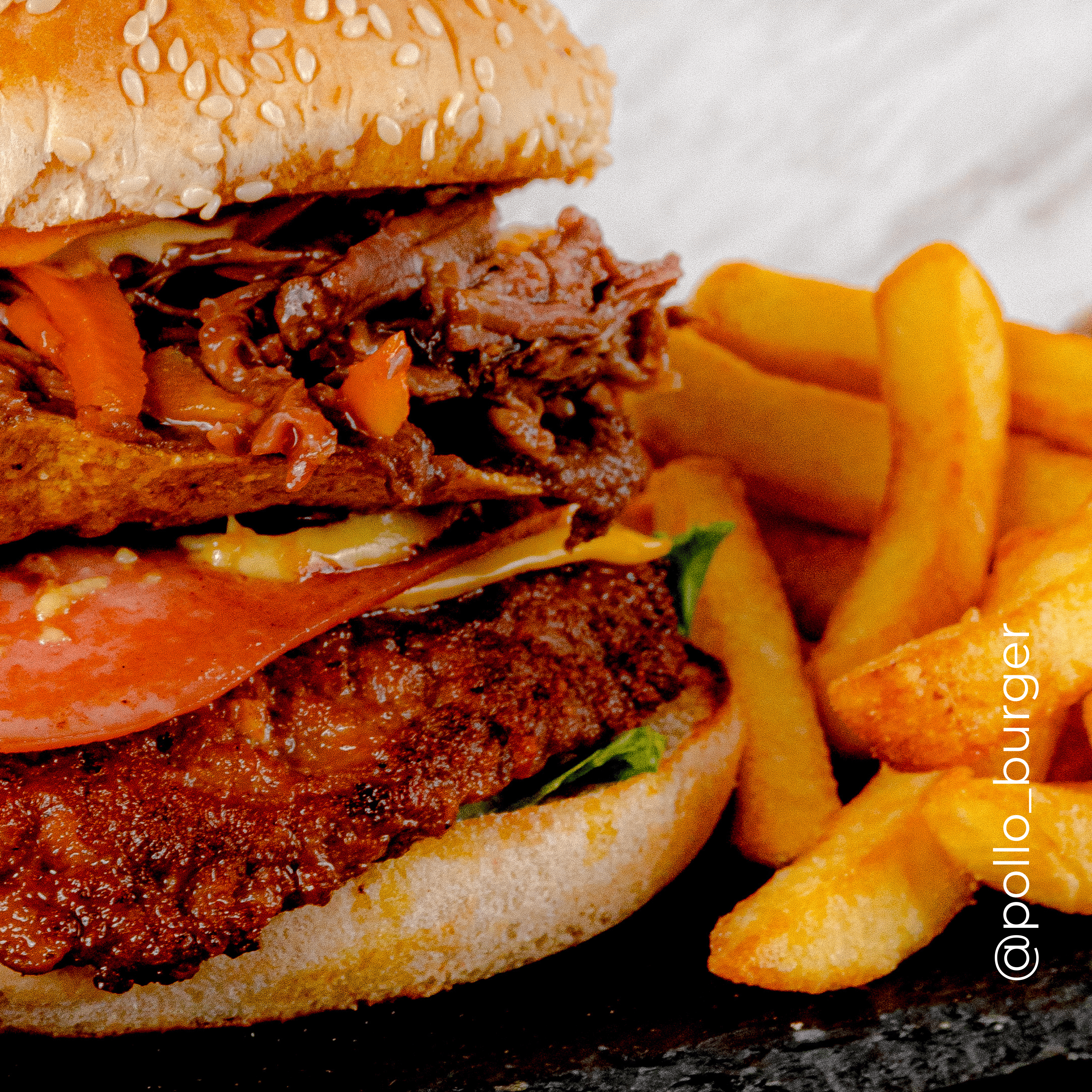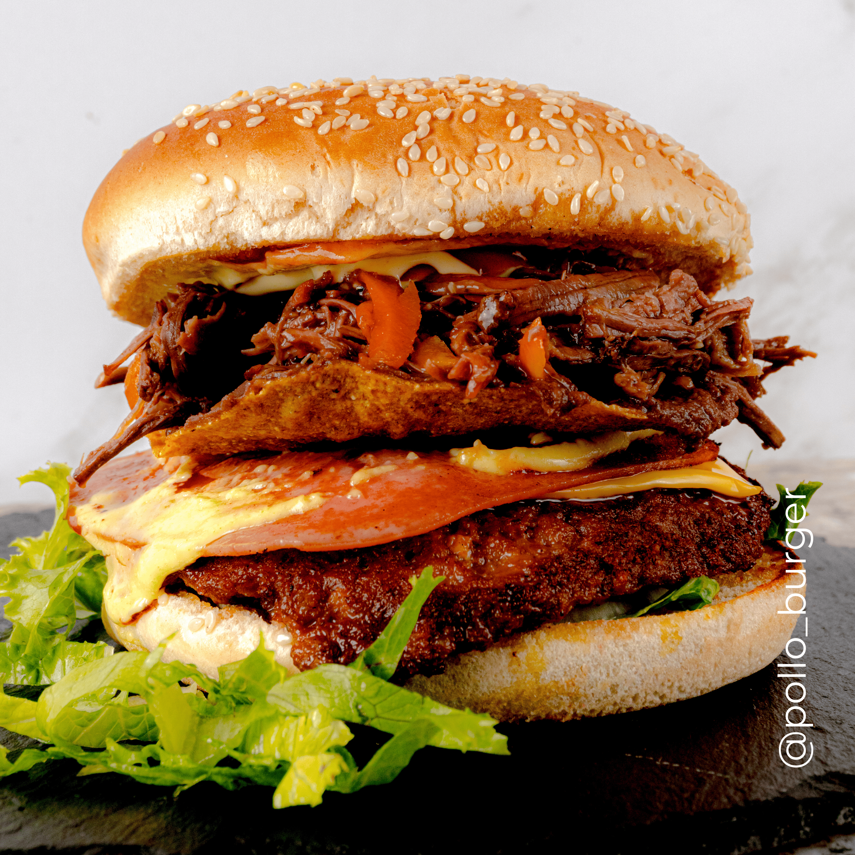 Hamburguesa bichota con torta 1/4 libra, lechuga, tomate, cebolla, tortilla tostada, carne mechada con salsas.