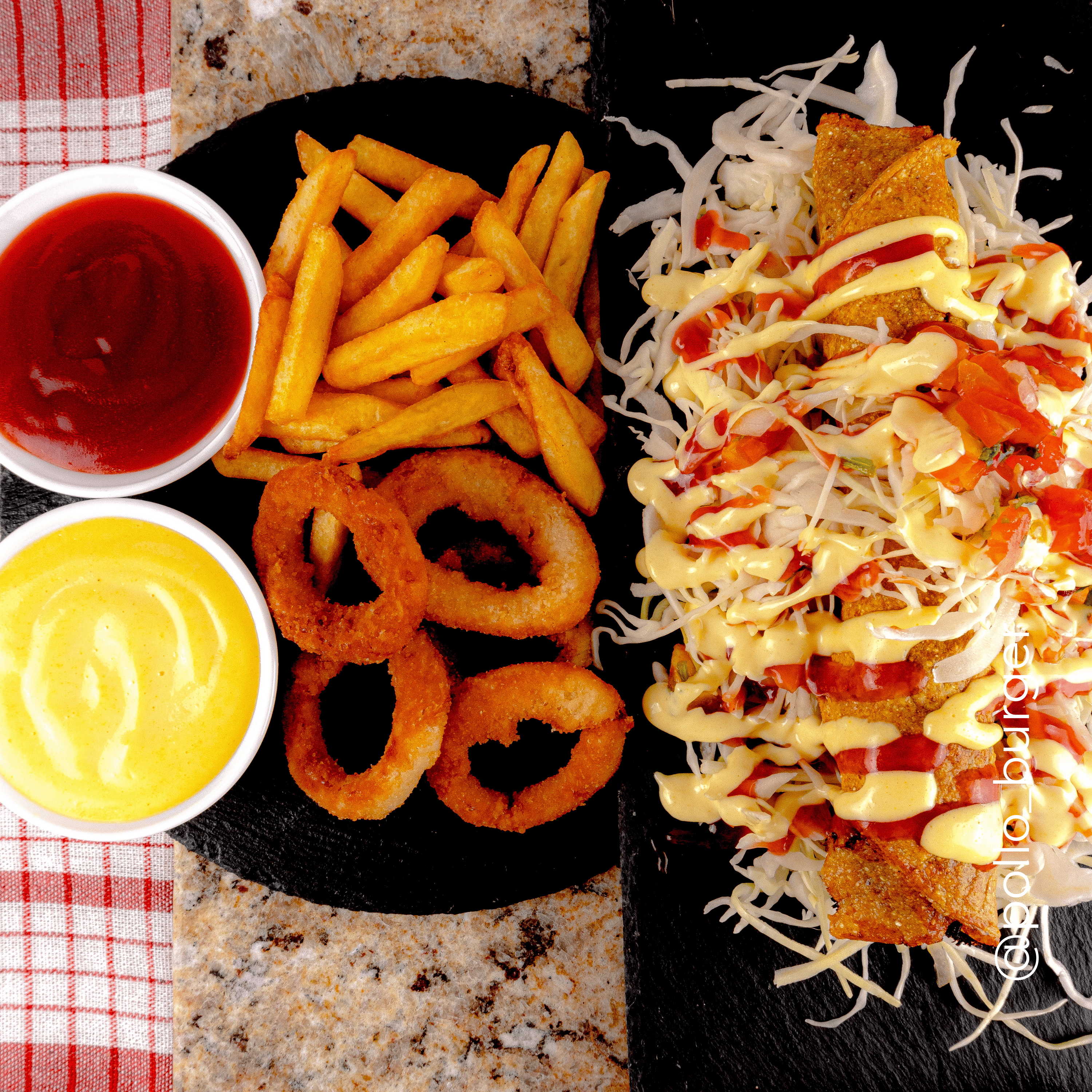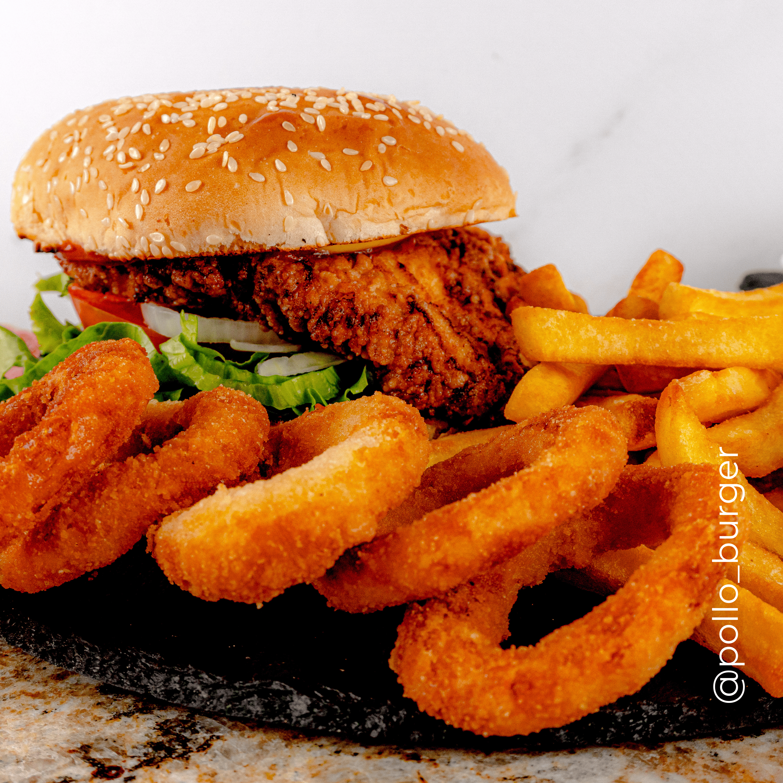Hamburguesa filet de pollo especial, queso, lechuga, tomate, cebolla, papas fritas y salsas.