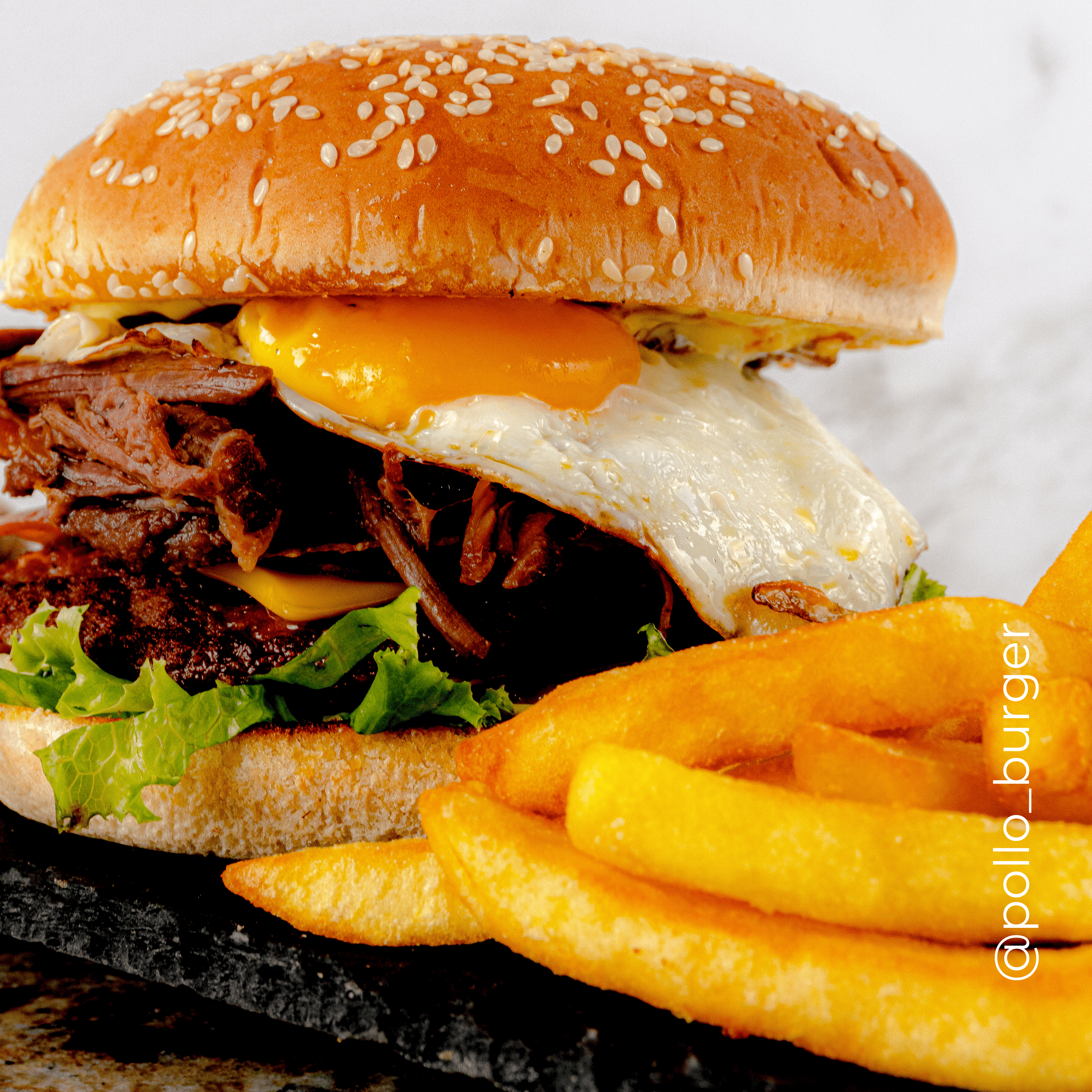 Hamburguesa de la casa con papas, torta 1/4 libra, lechuga, tomate, cebolla, tortilla tostada, carne mechada, huevo frito, y salsas.