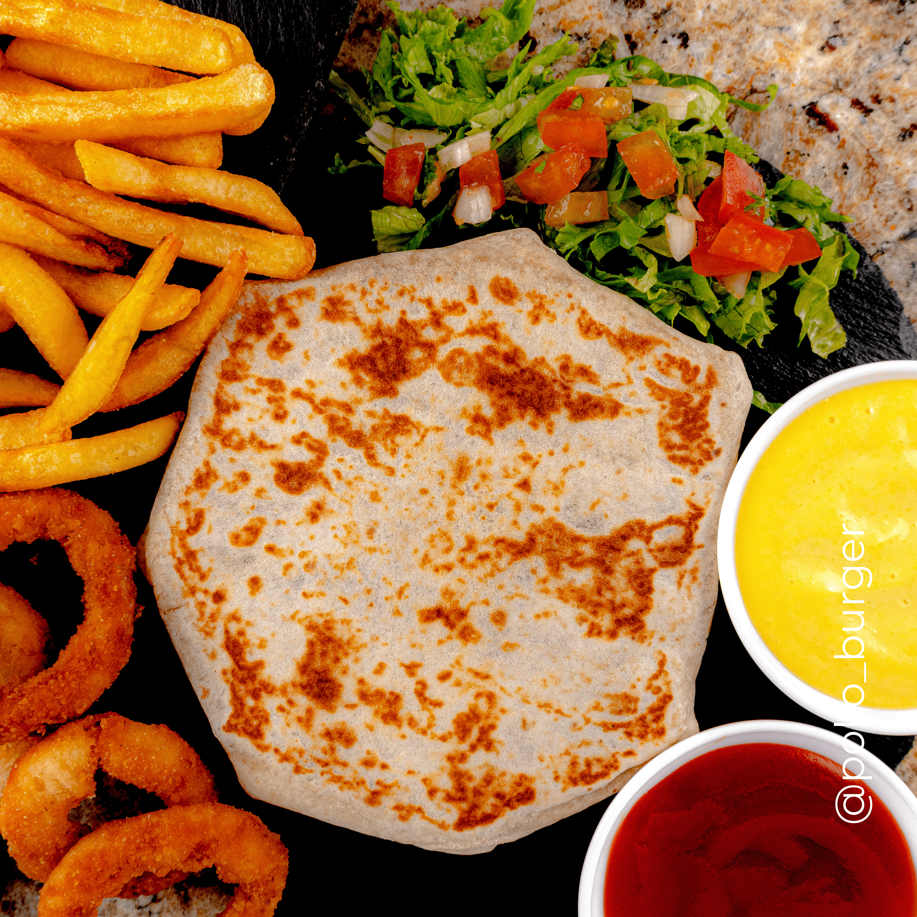 Burrito especial, frijoles, carne, queso amarillo, tortilla de trigo, pico de gallo, lechuga con papas fritas.