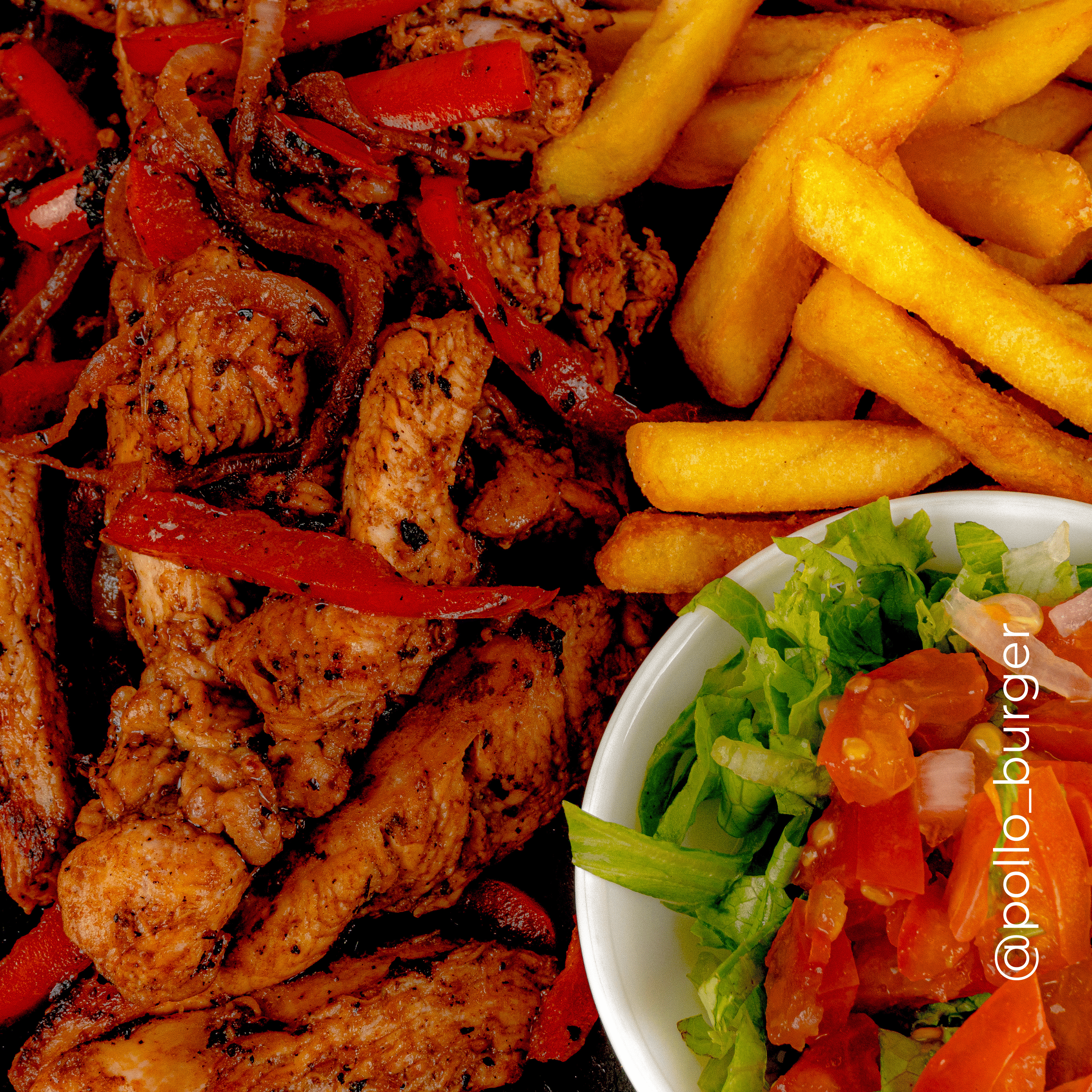 Fajitas de pollo, cebolla, chile dulce, ensalada con papas fritas.