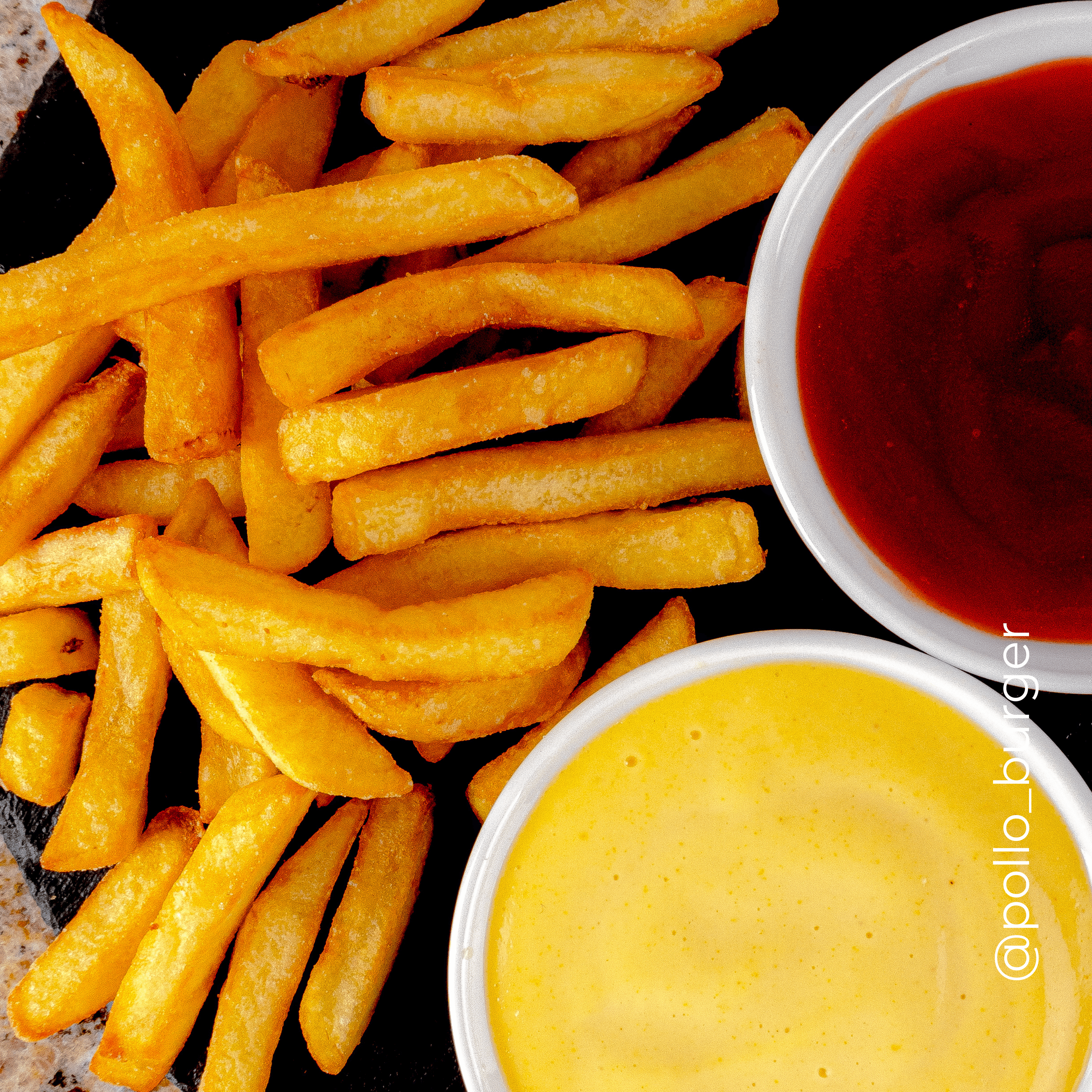 Papas fritas crujientes acompañadas con salsas de la casa.
