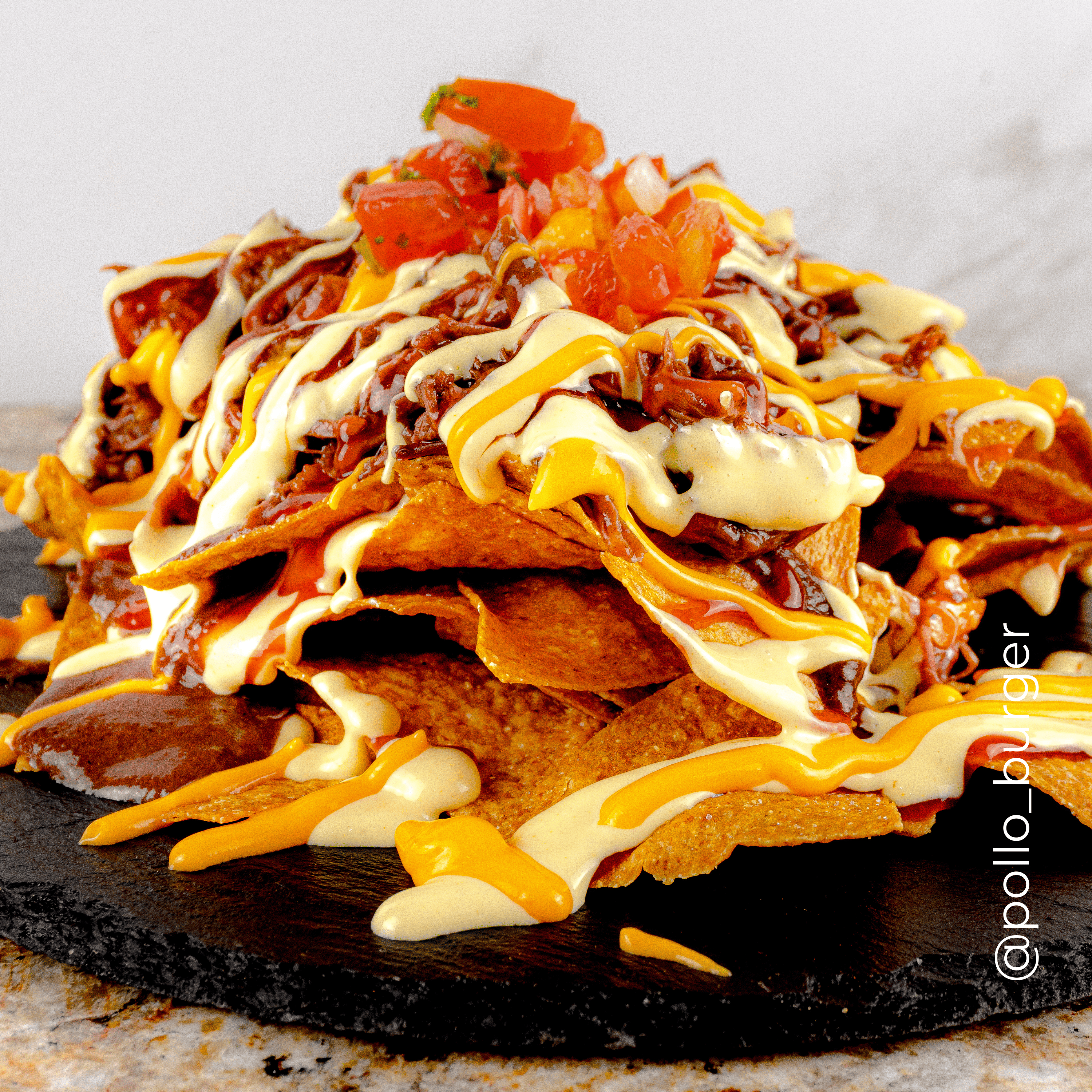 Tortillas de maíz fritas, relleno de carne, pico de gallo, salsa de queso y salsas de la casa.
