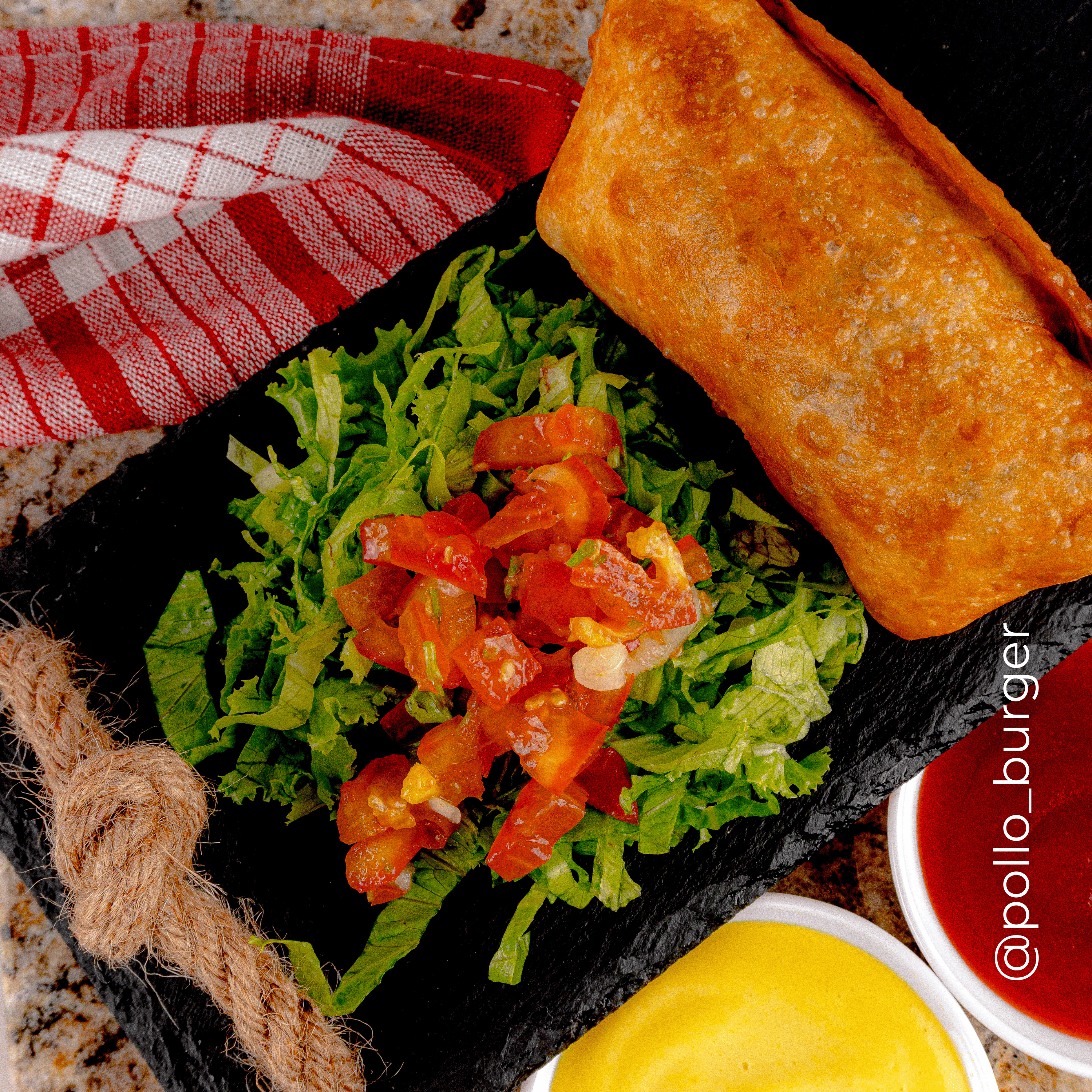 Crunchy wraps con papas, frijoles, carne, queso amarillo, tortilla de trigo, tortillas tostadas, pico de gallo y lechuga con papas fritas.