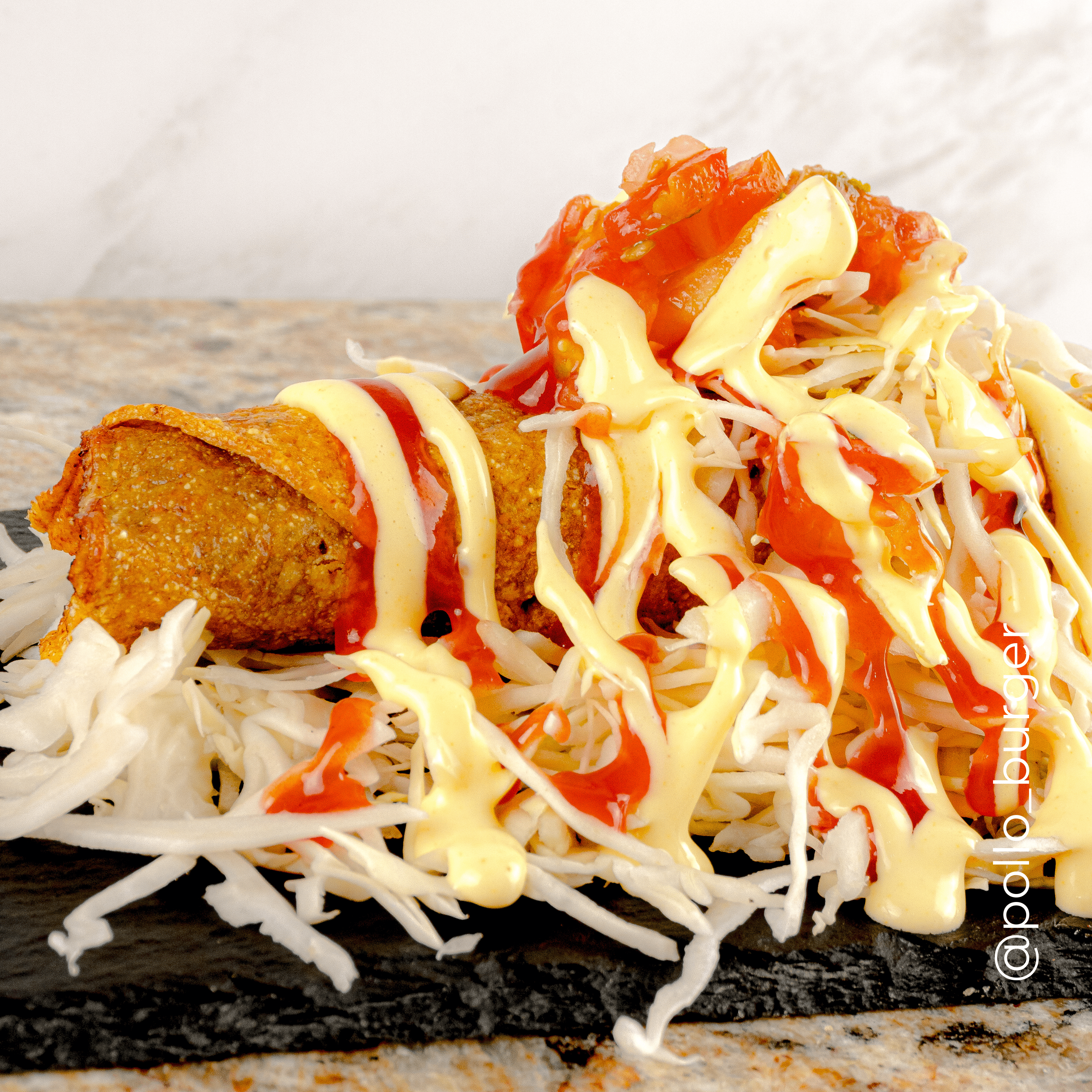 Tortilla de maíz frita, rellena de carne de res cocinada, acompañado de repollo, salsas de la casa y papas fritas.