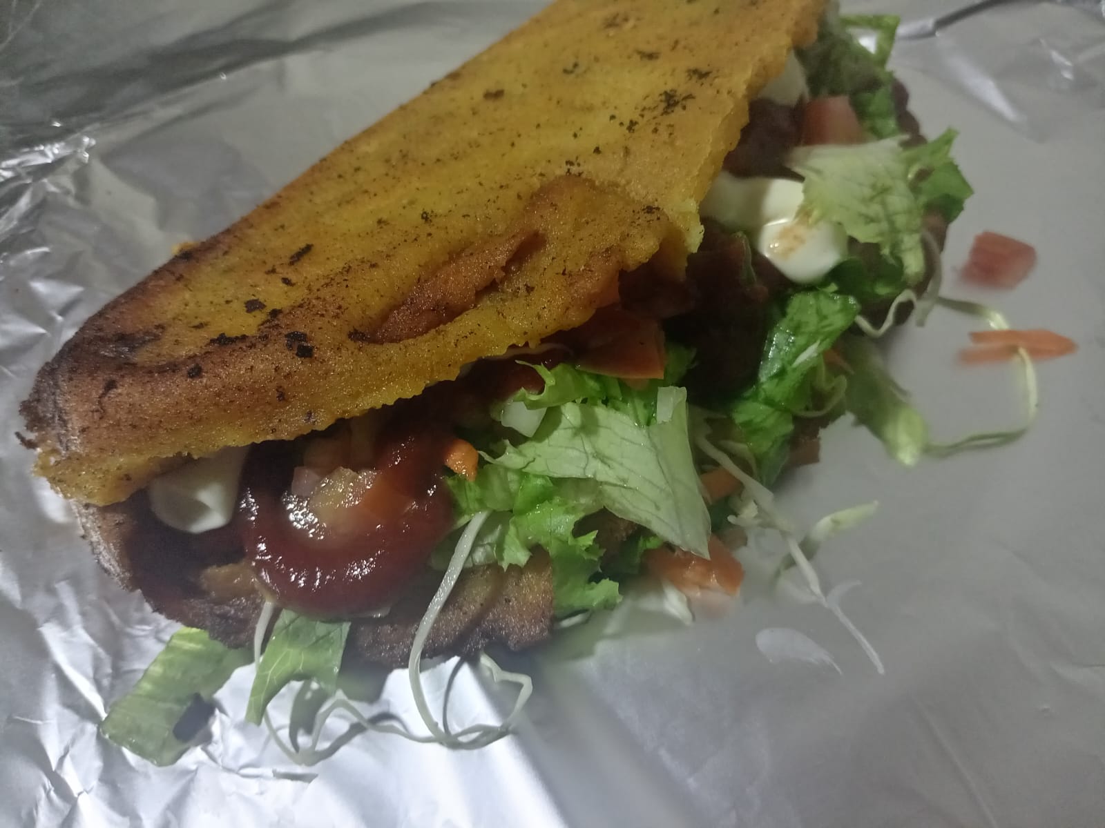Tortilla de maíz frita, rellena de carne de res cocinada, acompañado de repollo, salsas de la casa, papas frita y adicional a elegir.